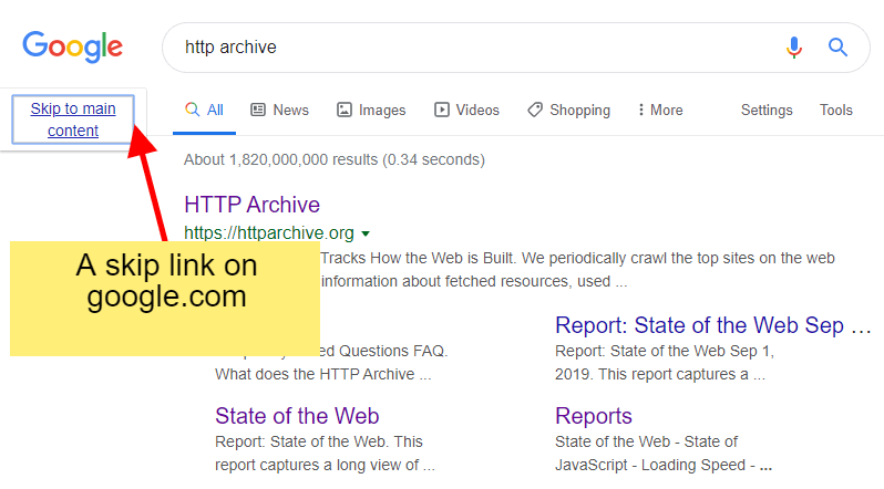If you’d like to see a skip link in action for yourself, you can! Just do a quick Google search and hit tab as soon as you land on the search result pages. You’ll be greeted with a previously hidden link just like the one in Figure 9.7.