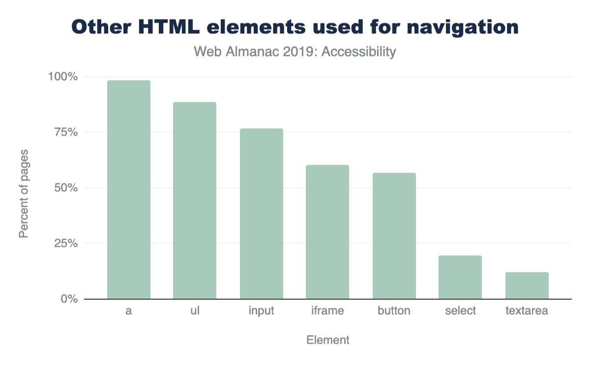 Many popular screen readers also allow users to navigate by quickly jumping through links, lists, list items, iframes, and form fields like edit fields, buttons, and list boxes. Figure 9.6 details how often we saw pages using these elements.