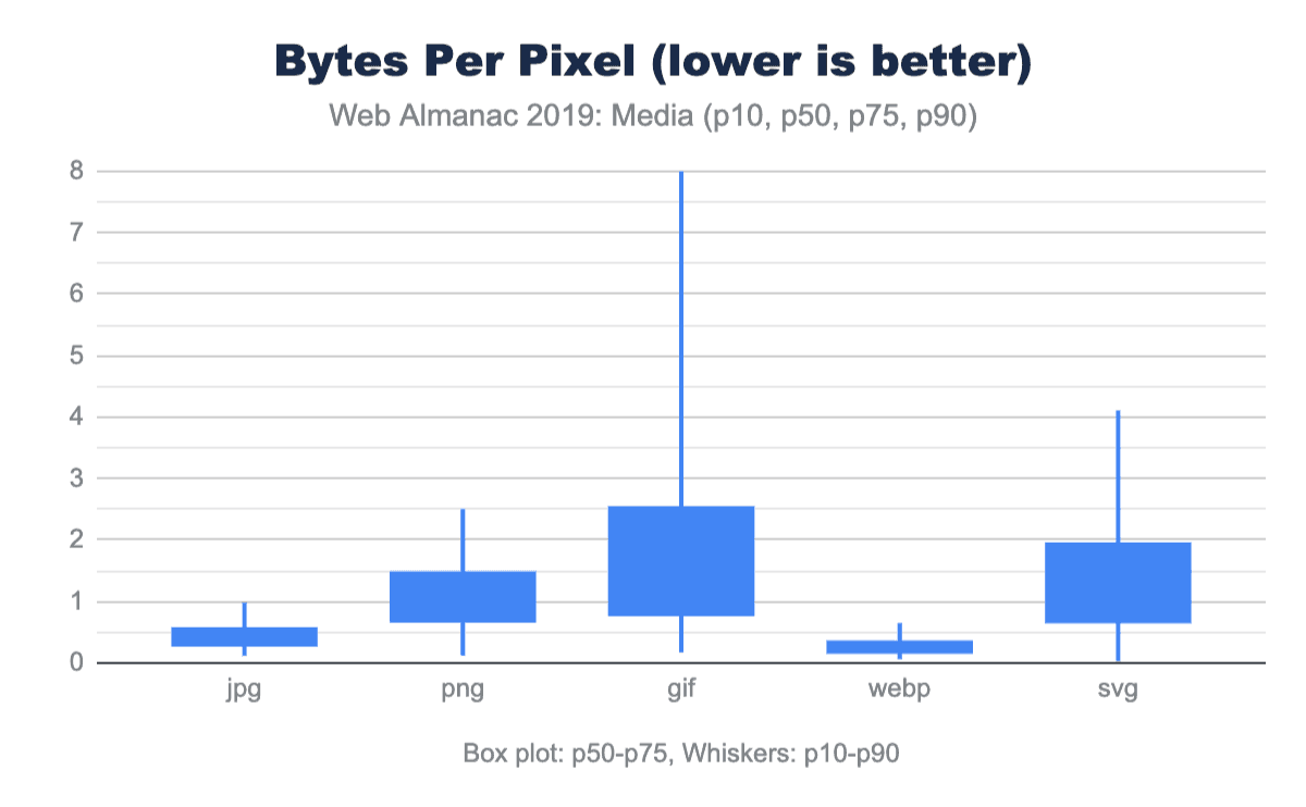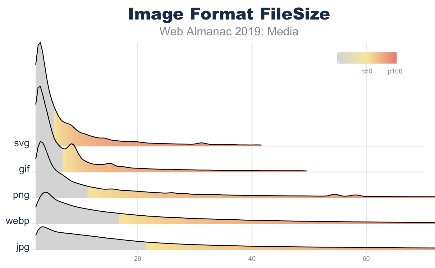 While previously it appeared that GIF files were smaller than JPEG, we can now clearly see that the cause of the larger JPEG resources is due to the pixel volume. It is probably not a surprise that GIF shows a very low pixel density compared to the other formats. Additionally, while PNG can handle high bit depth and doesn’t suffer from chroma subsampling blurriness, it is about twice the size of JPG or WebP for the same pixel volume.