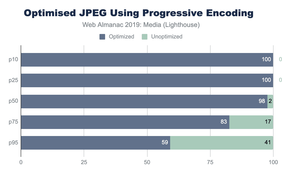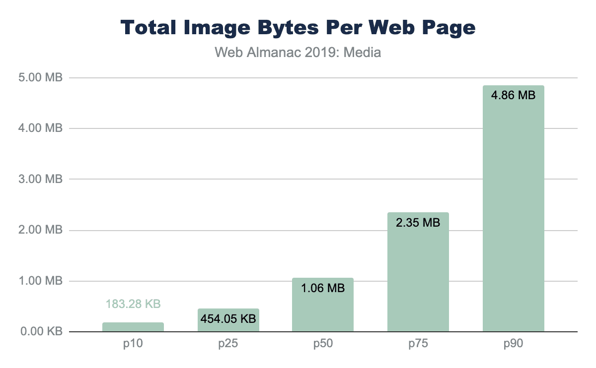 From a pure bytes perspective, HTTP Archive has historically reported an average of two-thirds of resource bytes associated from media. From a distribution perspective, we can see that virtually every web page depends on images and videos. Even at the tenth percentile, we see that 44% of the bytes are from media and can rise to 91% of the total bytes at the 90th percentile of pages.