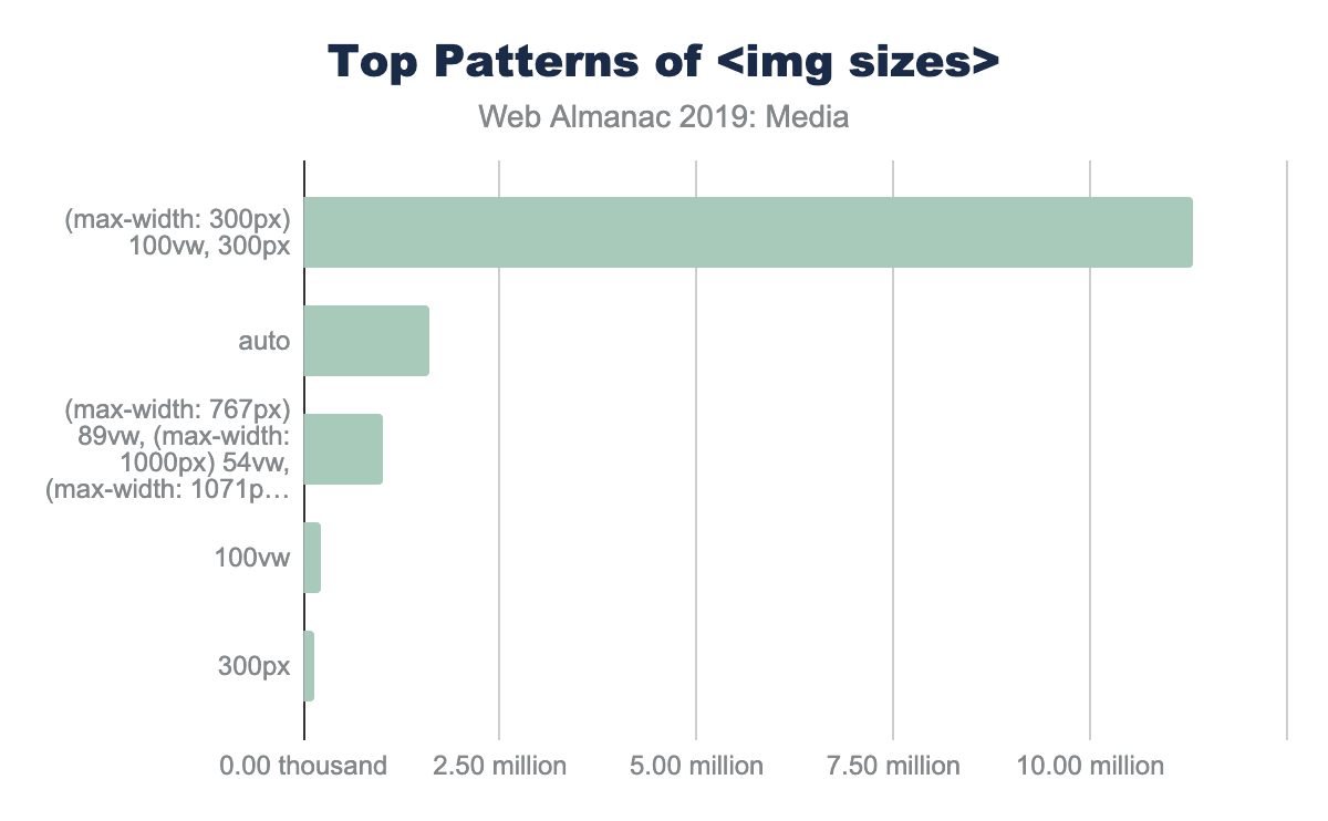 (max-width: 300px) 100vw, 300px’, 1.60 million use ’auto’, 1.00 million use ’img sizes=(max-width: 767px) 89vw...etc.’, 0.23 million use ’100vw’ and 0.13 million use ’300px’<img sizes>.