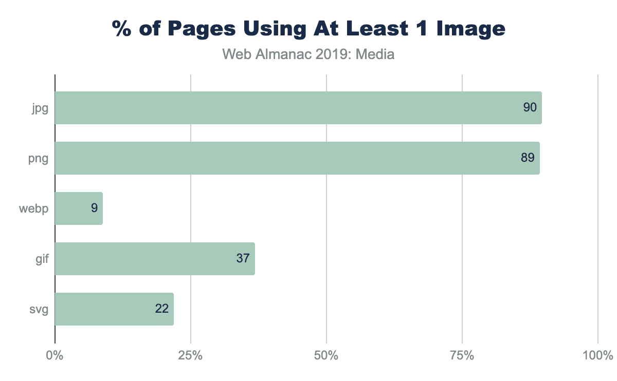 While the median page has nine JPEGs and four PNGs, and only in the top 25% pages GIFs were used, this doesn’t report the adoption rate. The use and frequency of each format per page doesn’t provide insight into the adoption of the more modern formats. Specifically, what percent of pages include at least one image in each format?