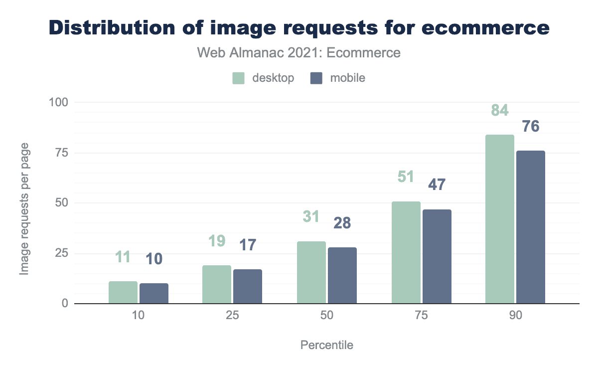 The median ecommerce site on mobile made 30 requests to third parties. While last year’s analysis saw an increase in third-party requests, this year the number is static with little change almost across the board. There is a slight change where the top 10% of pages have reduced the number of third-party requests from 98 to 91 on mobile and 103 to 96 on desktop.