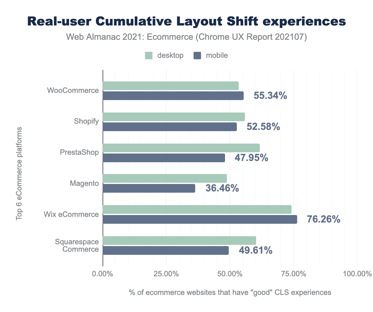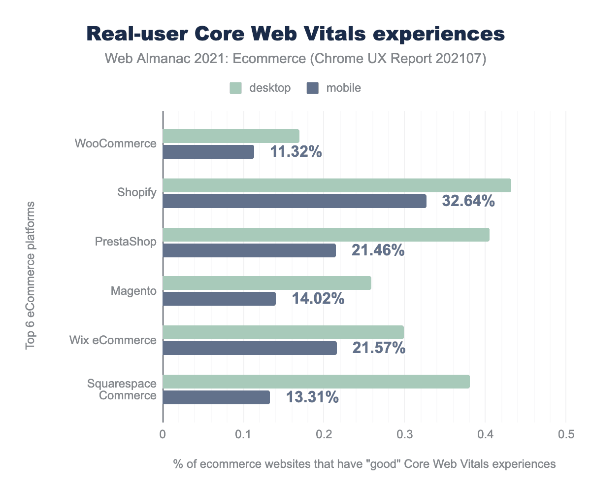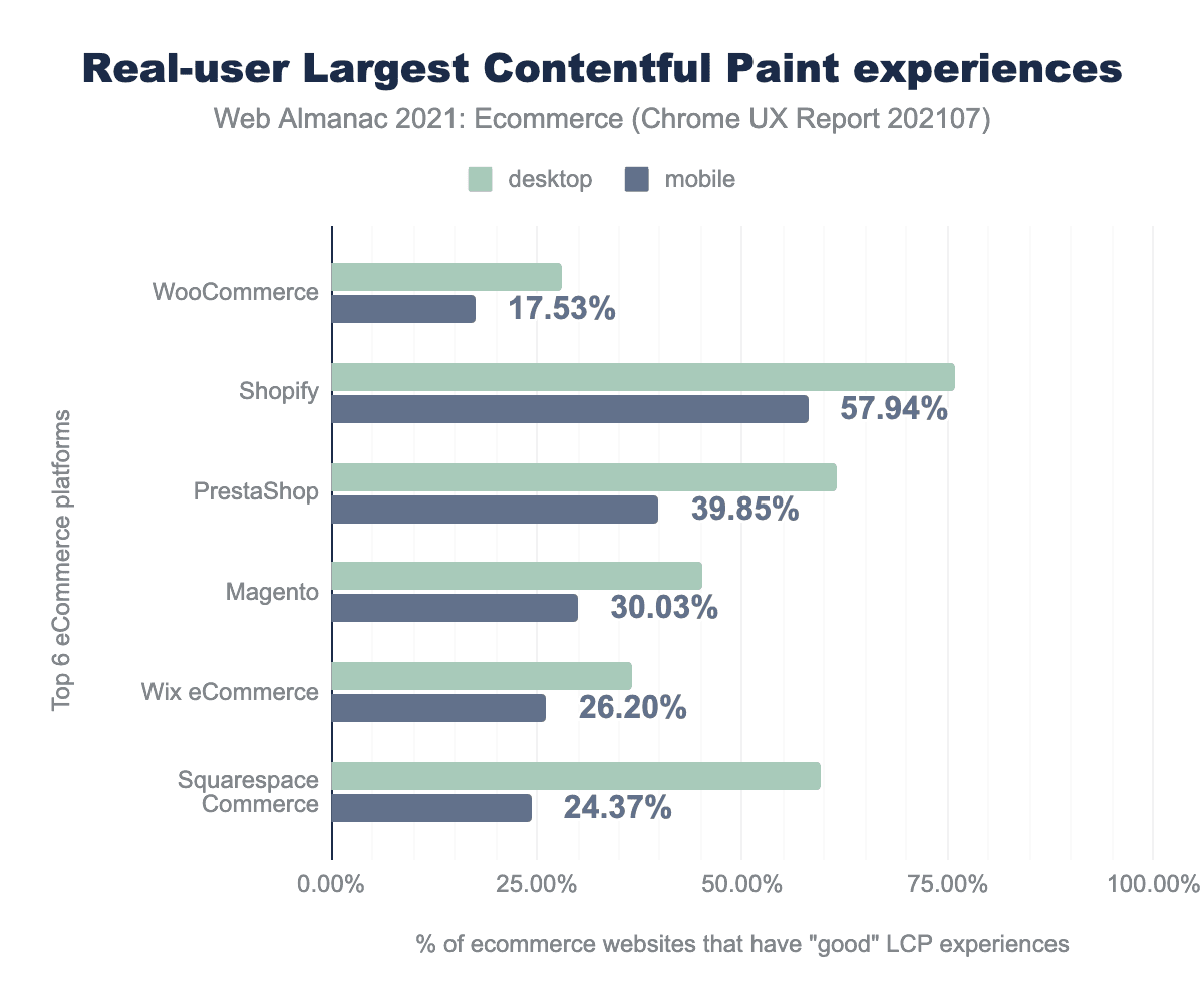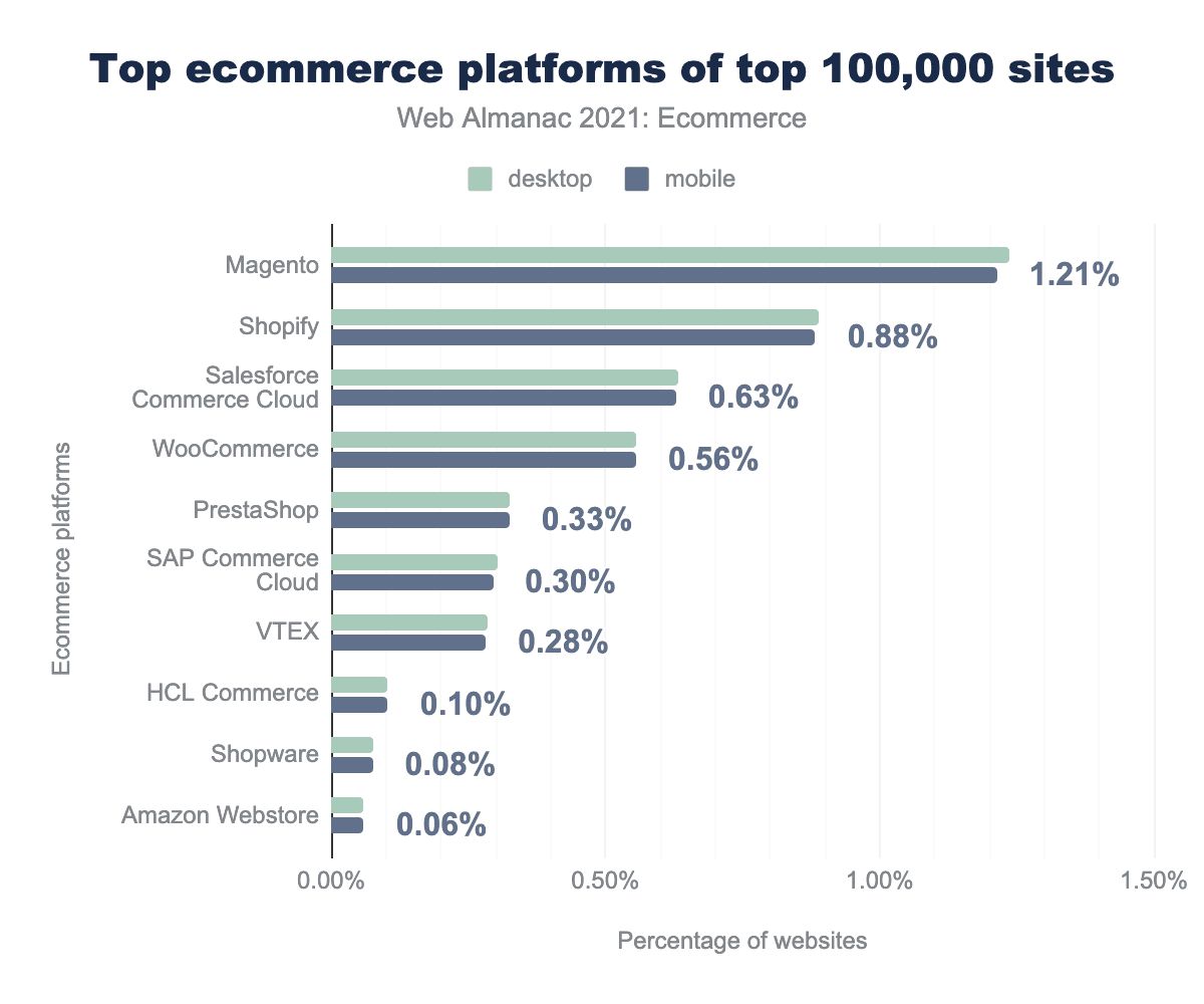This year, the Chrome User Experience Report provided a popularity rank for each website. This allowed us to break down top ecommerce platforms by their popularity in different segments of the market. “All” refers to all 7.5 million sites that were profiled on mobile and 6.3 million sites for desktop.