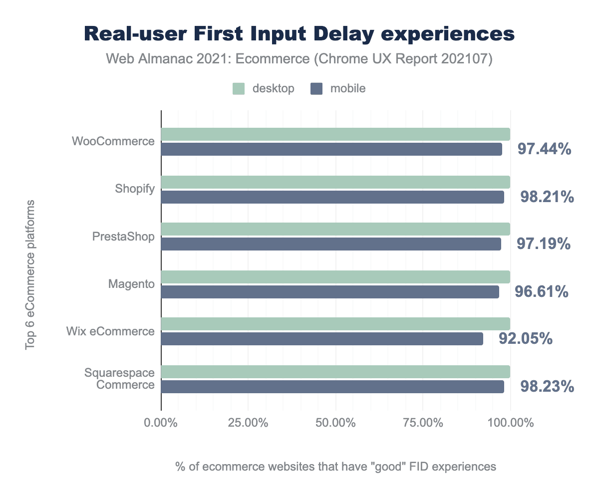Our analysis considered mobile and desktop websites. These sites are those that are actively visited by Chrome users, see the Methodology for more information. Most of the websites visited are in both result sets but some are only in one. We will often share statistics for mobile and desktop. When there is little variation, we may choose to only show one. In this case, unless otherwise noted, only the mobile metrics will be shown.