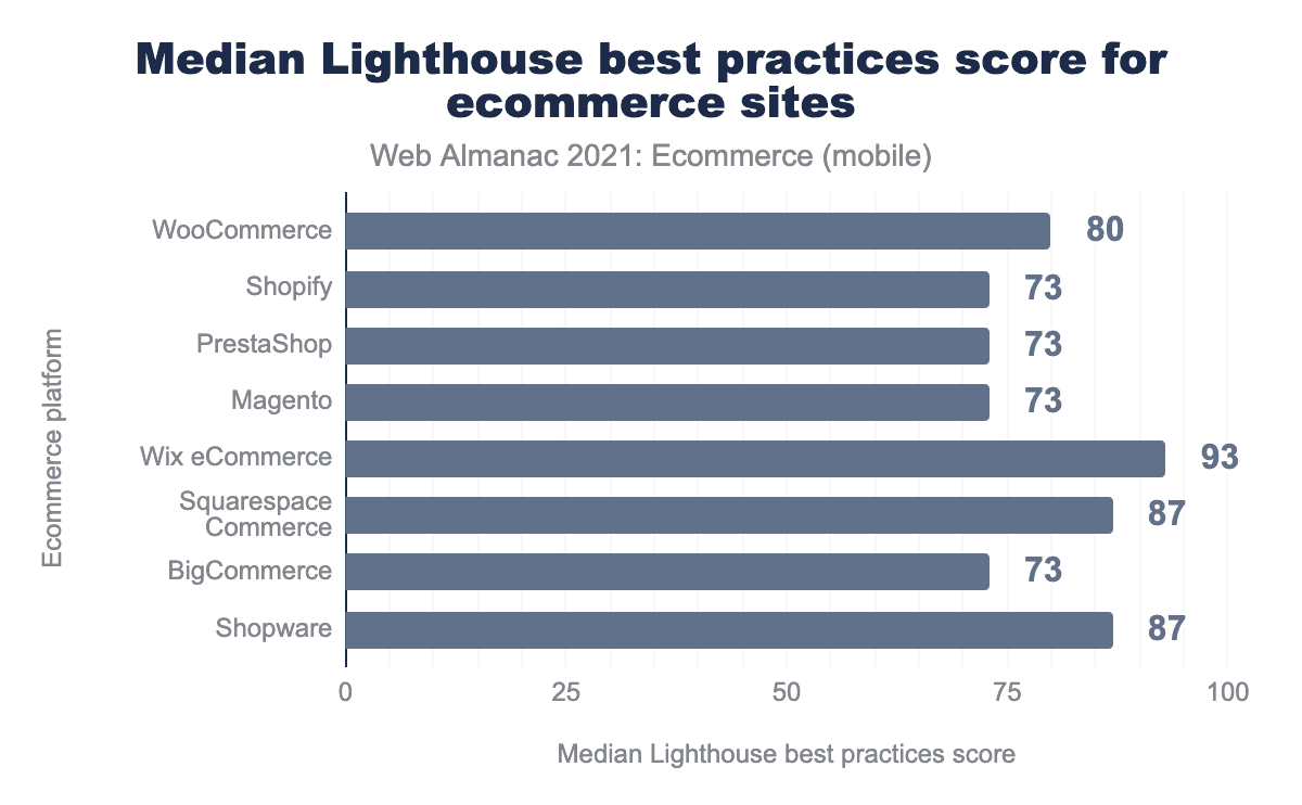 When we broke the Lighthouse scores down by ecommerce platform vendors, there was relatively little variation. This suggests that each ecommerce platform provides similar out-of-the-box capabilities in each of these areas.