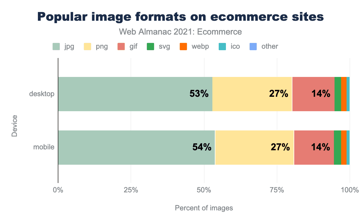 The most popular image format was JPG with 54% of images being in this format on mobile. This is an 8% increase on last year when 50% of images were JPGs.