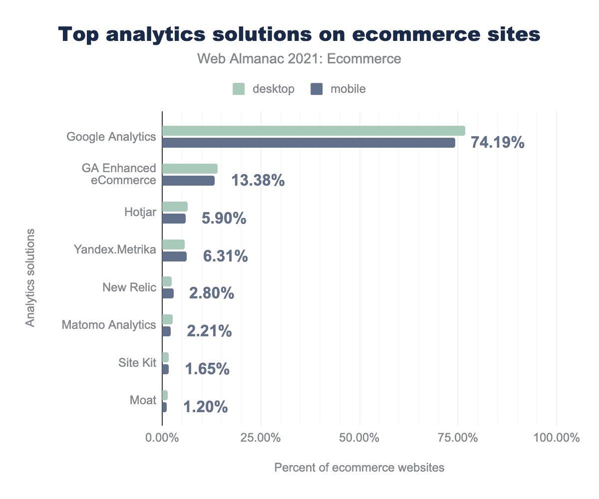 Google Analytics is the most popular analytics tool, found on 74.19% of websites (mobile). Bemusedly, only 13.38% of mobile requests and 13.99% of desktop requests noted the use of enhanced ecommerce. However, as the main enhanced ecommerce features are for tracking the ecommerce journey through product listing page, product detail page, cart, and checkout, perhaps the reason that we do not see a greater percentage is due to a limitation of the survey being restricted to home pages.