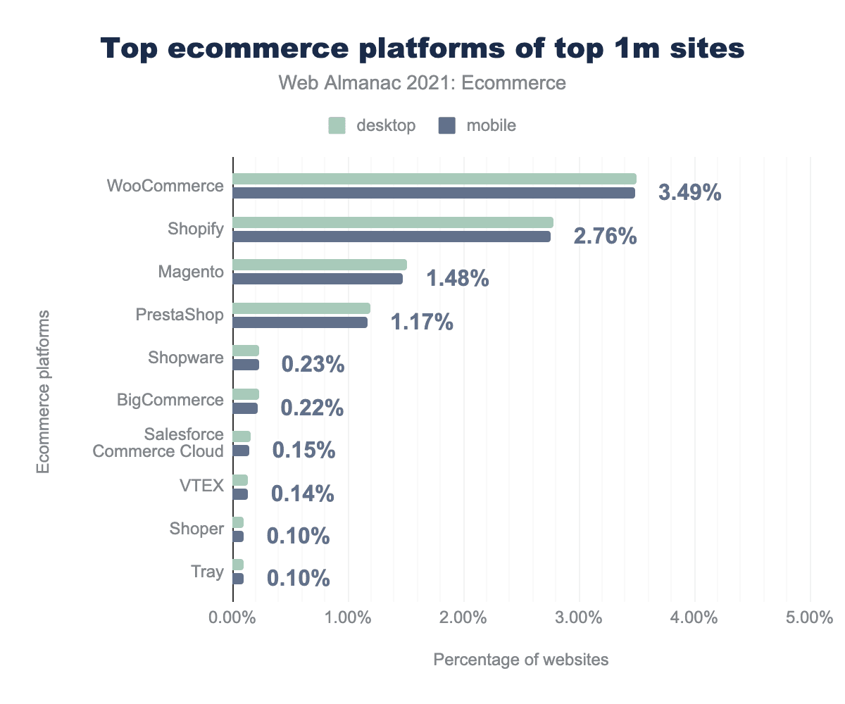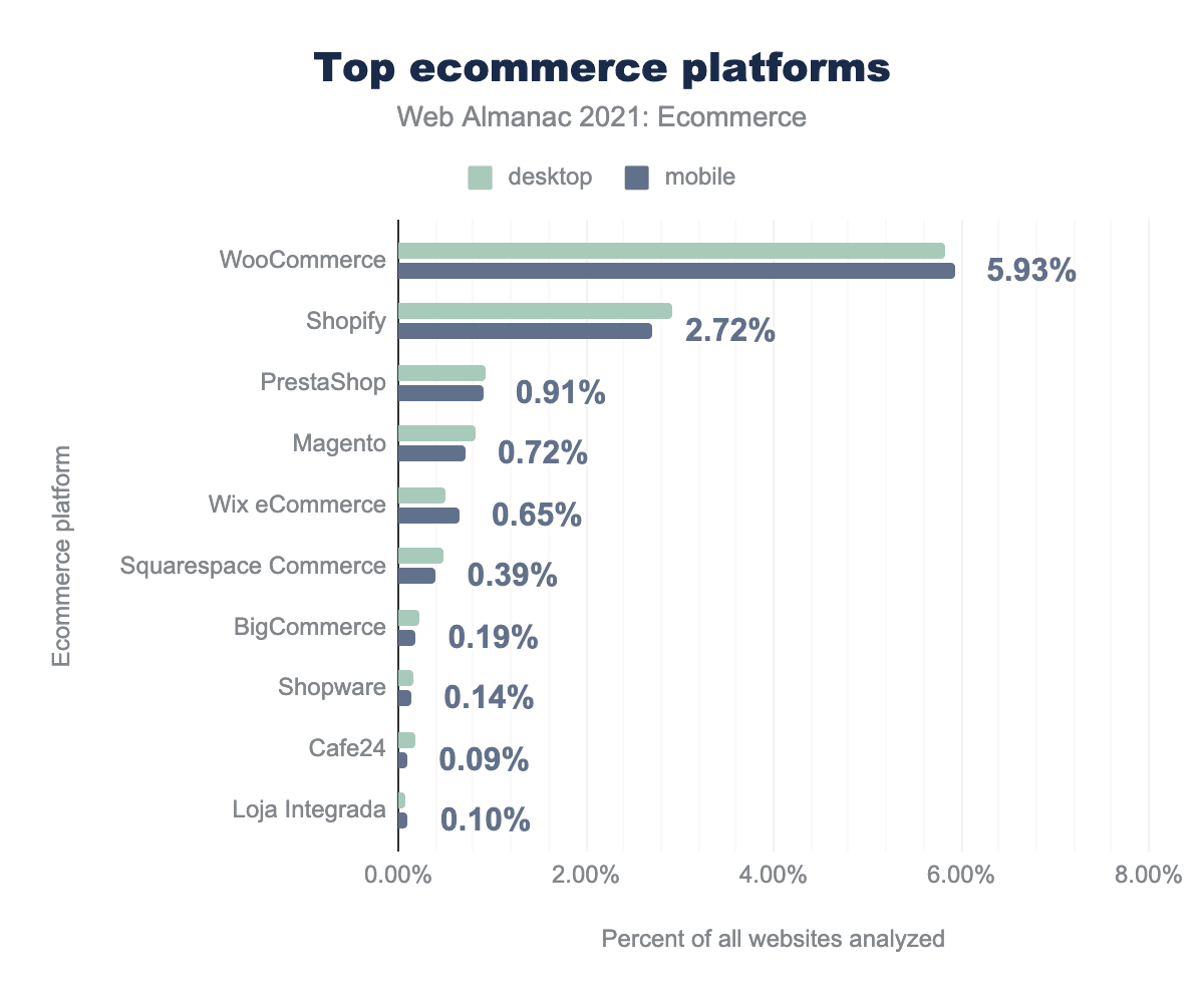 WooCommerce, a plugin for WordPress, is the most prevalent ecommerce platform with almost 6% of all websites using it. This represents 30% of the ecommerce market on mobile.