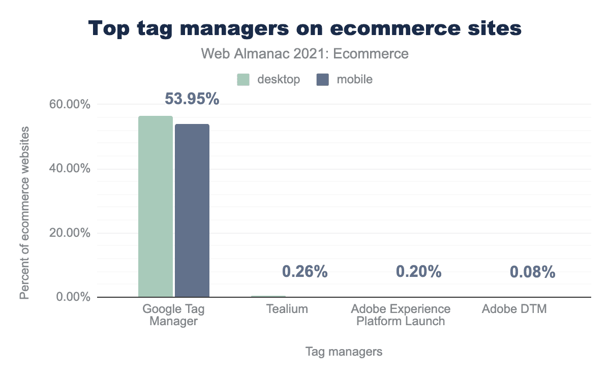 Google Tag Manager is by far the market leader with 56.39% usage on desktop and 53.95% on mobile. In second and third places were Tealium (0.26% mobile) and Adobe Experience Platform Launch (0.20% mobile).