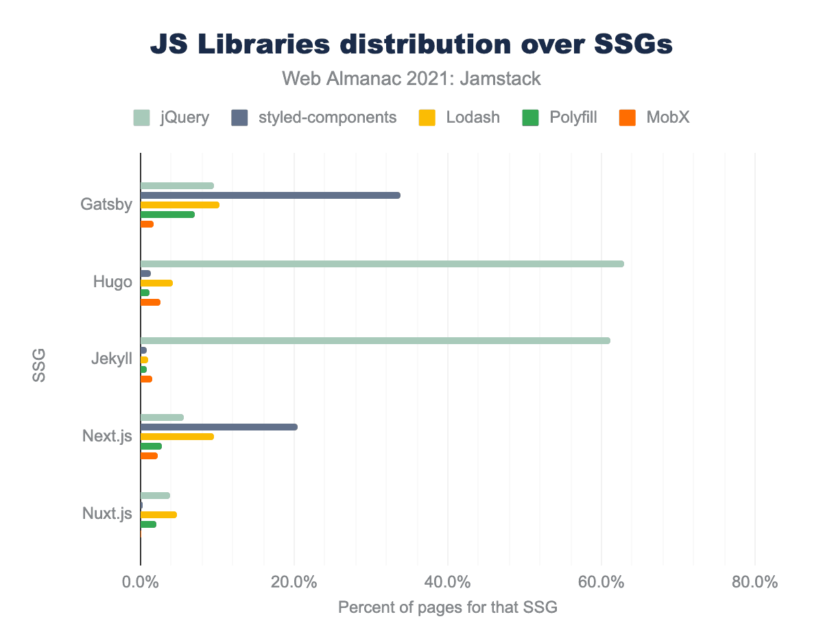 A big surprise for us was jQuery. It wasn’t a surprise that it’s used for Hugo and Jekyll based sites (more than 60%), but that it’s used inside React and Vue based sites wasn’t expected! Next.js, Many Nuxt,js, and Gatsby sites use jQuery too.