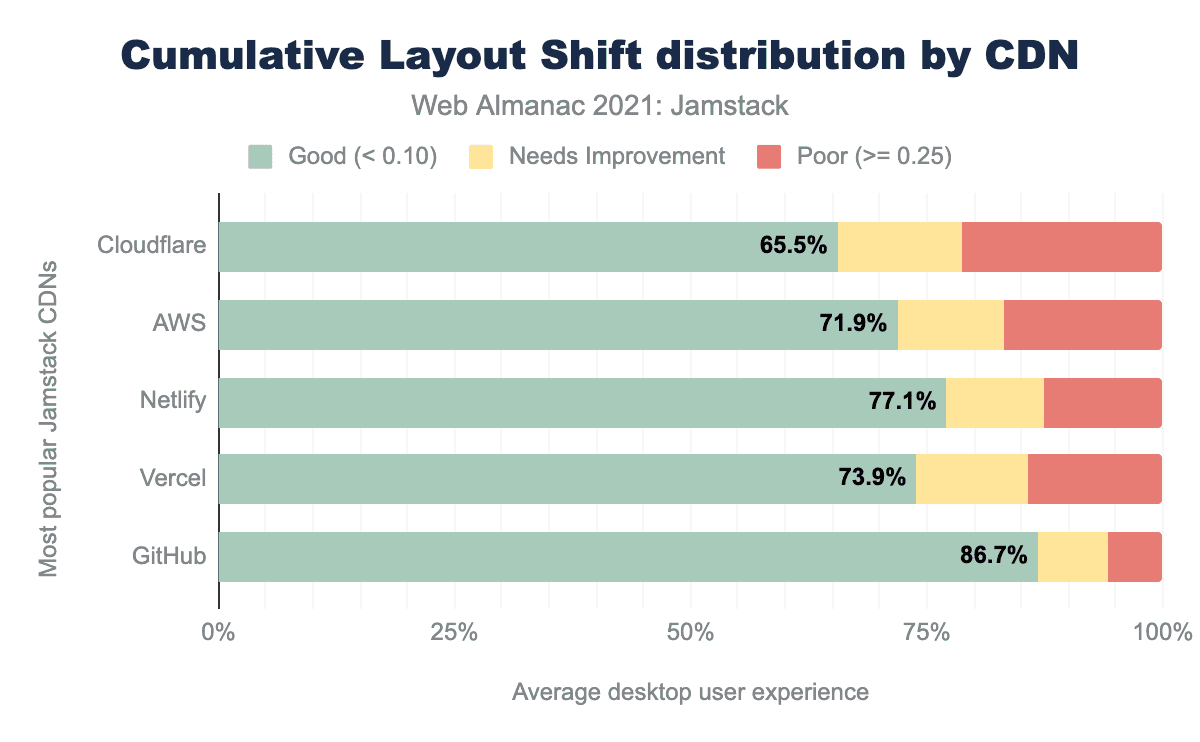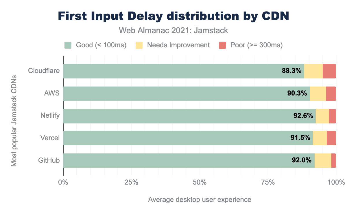 All CDNs deliver Jamstack sites with 88% good FID or above, though interesting that the Cloudflare and AWS sites fare slightly worse than the Jamstack-orientated CDNs.