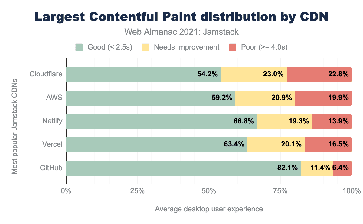 GitHub tops the stats when measuring on CDN level, likely reflecting the simpler sites hosted here. Netlify, a Jamstack-oriented CDN, comes next with 66.8% of sites having a good LCP followed by Vercel with 63.4% followed by AWS with 59.2% and Cloudflare at 54.2%.