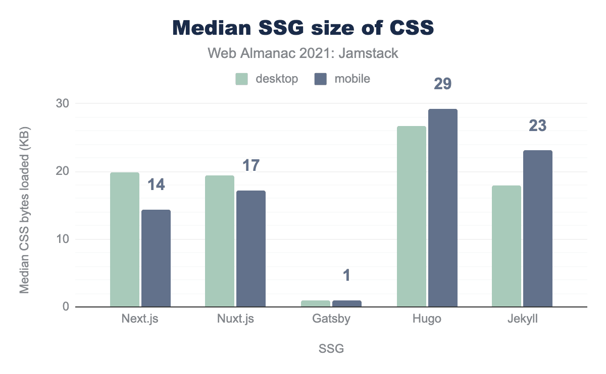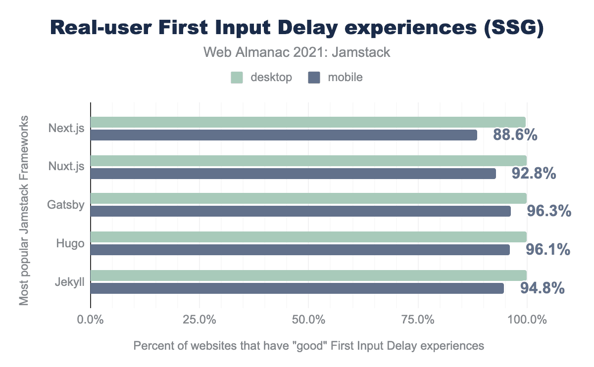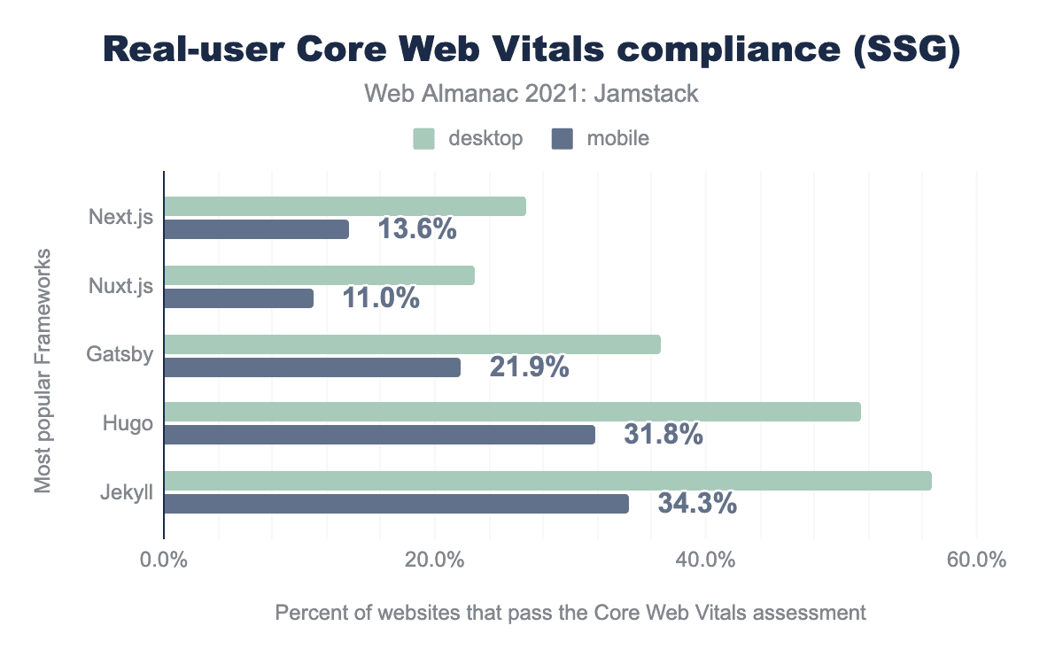 Looking at mobile results, Jekyll and Hugo have the best results over SSGs—34.3% and 31.8% of all sites scored good. Gatsby is third with 21.9%, but it’s the first of the JavaScript-based SSGs. Next.js with 13.6% of good performance pages and Nuxt.js has 11.0%.