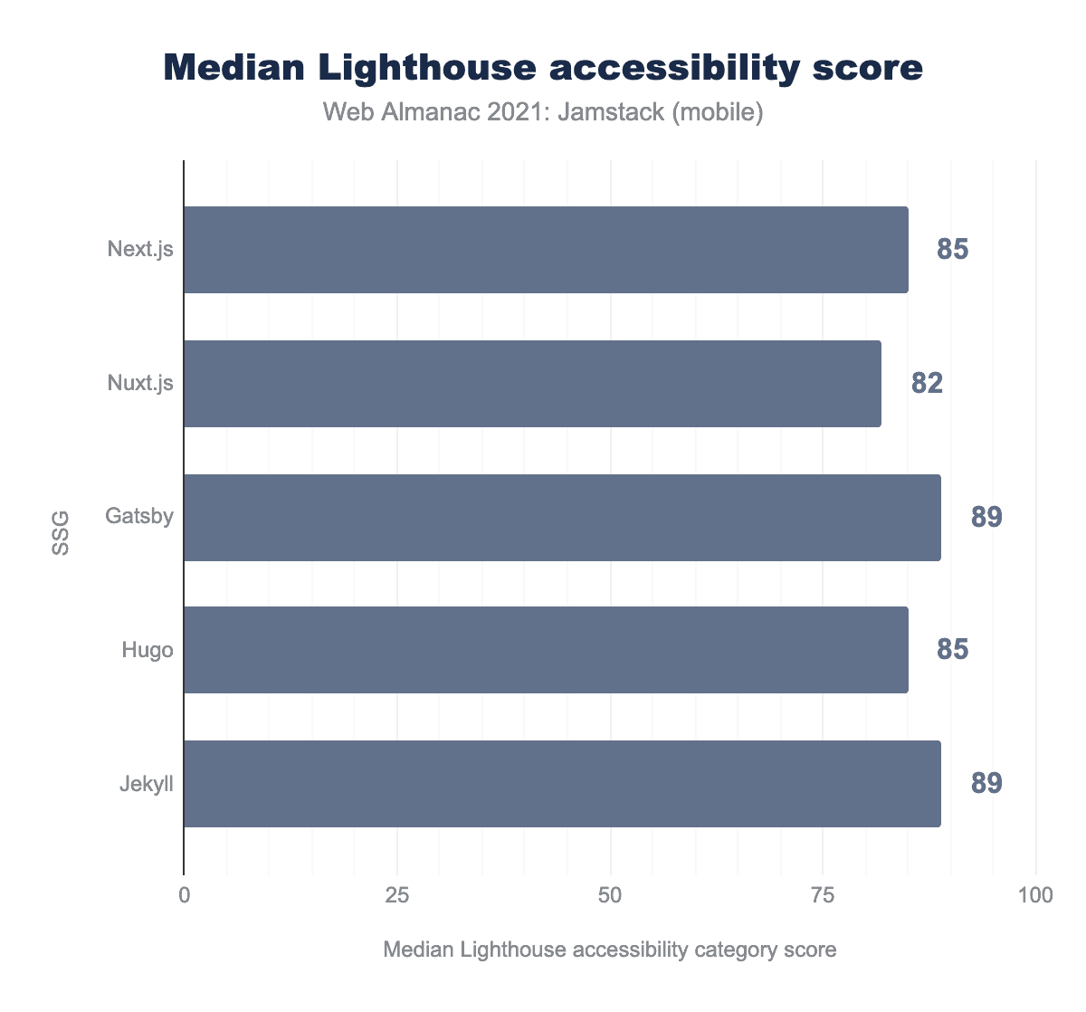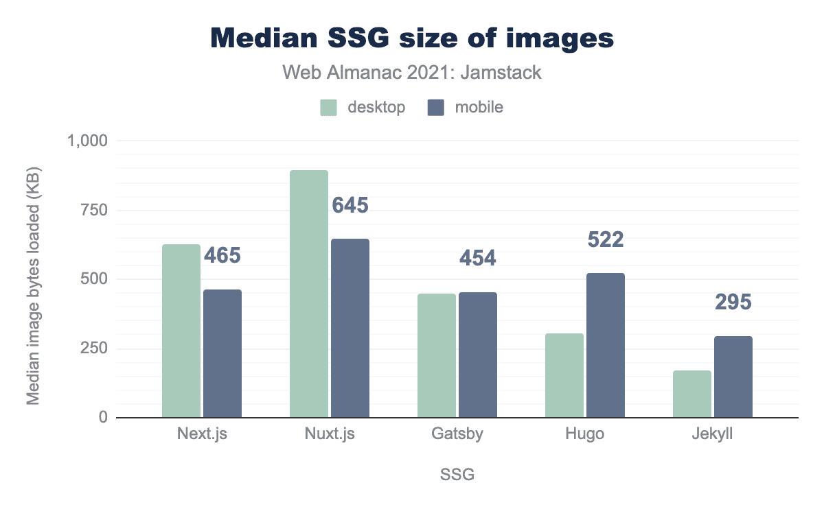 The median performance score for all SSGs across mobile varies. The top 3 SSGs with by popularity can’t even surpass a score of 40. Since they are used in top ranking sites and since users a likely distributed all around the world, we can assumed that they are used across many different devices and networks. We can expect more out-of-the-box improvements like Next.js image component to help performance.