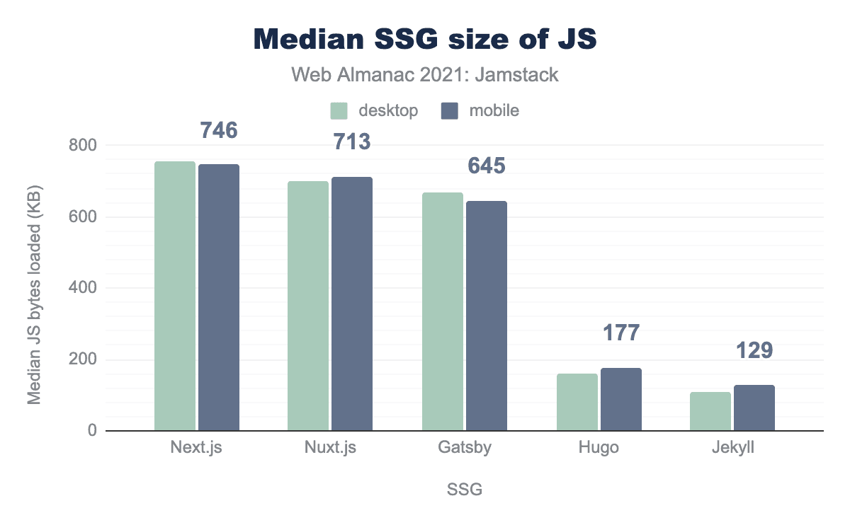 Nuxt.js has the highest value at 645 KB. Hugo is next with 522 KB. Next.js and Gatsby are almost the same at 465 KB and 545 KB respectively. Jekyll has the lowest value at 295 KB.