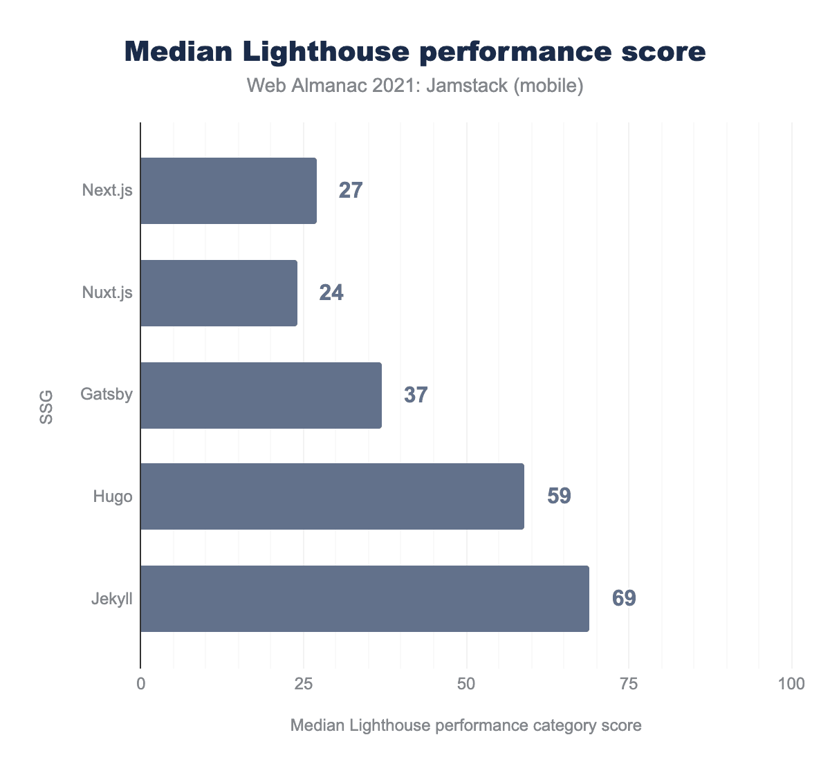 Jekyll is a stand out, achieving a score of almost 70 which is a great result for such a mastodon in the SSG area. Learn more about Lighthouse performance audit to understand exactly what measures are included in this score.