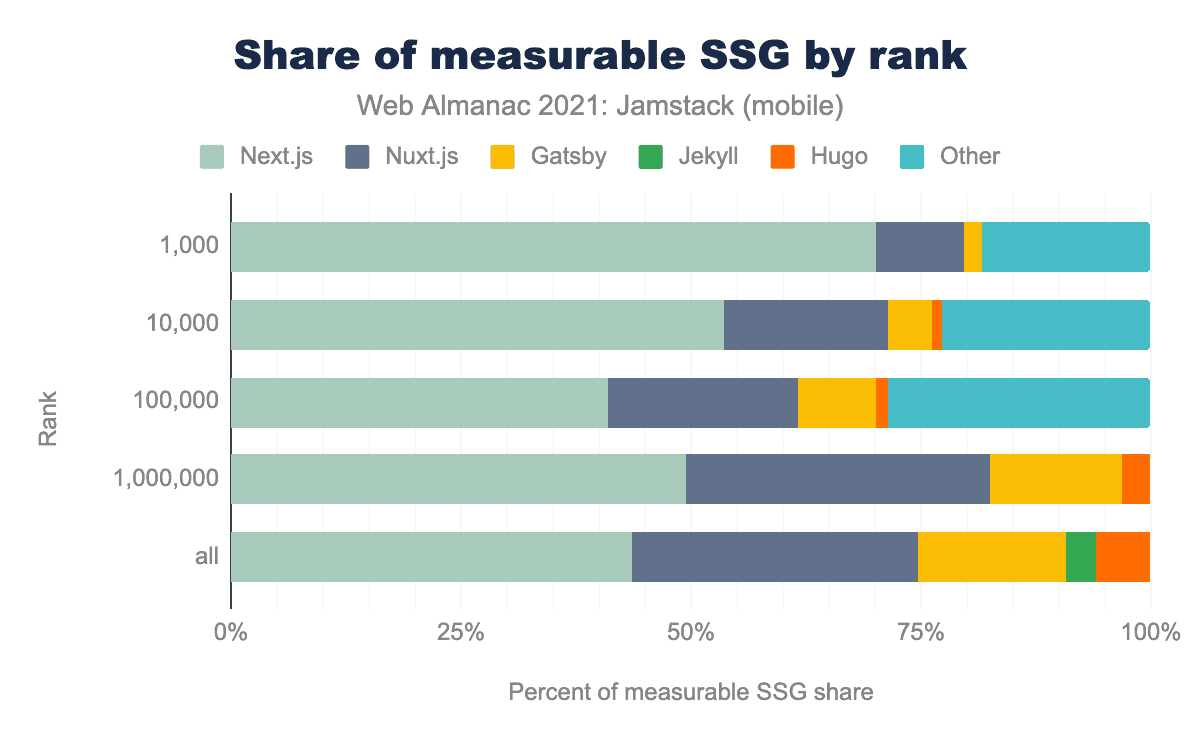 We know that Next.js covers around 40% of measurable Jamstack sites. It’s not only trending, but also used in 3.8% of the top 1,000 sites followed by the other popular SSGs such as Nuxt.js and Gatsby. These are all relatively new players just a few years in the space but they have solidified their place by good usage among top ranked sites as well.