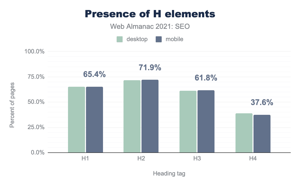 h1 headings were found on 65.4% of pages, h2s were found the most frequently on 71.9% of pages, h3s were found on 61.8% of pages and h4 headings were found on 37.6% of pages.For main headings, more pages (71.9%) have h2s than have h1s (65.4%). There’s no obvious explanation for the discrepancy. 61.4% of desktop and mobile pages use h3s and less than 39% use h4s.