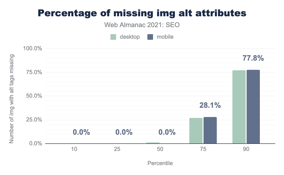 alt attributes missing per percentile (10, 25, 50, 75, and 90). The median web page had 1.4% of images with alt attributes missing on desktop on zero alt attributes missing on mobile.alt attributes.
