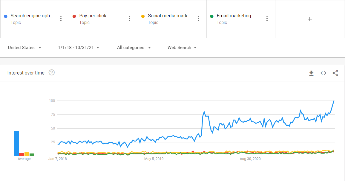 SEO is more popular than ever and has seen huge growth over the last couple years as companies sought new ways to reach customers. SEO’s popularity has far outpaced other digital channels.