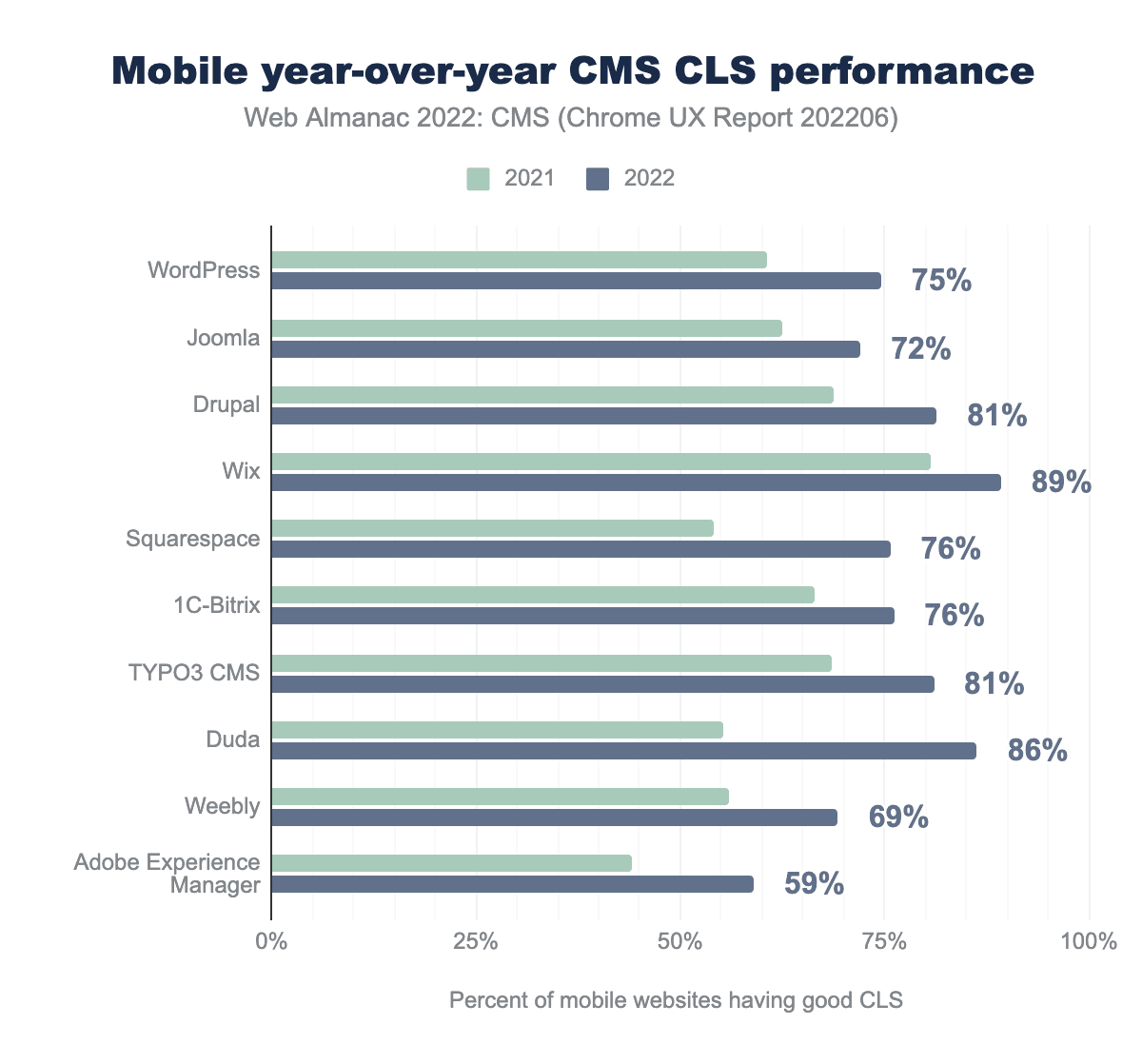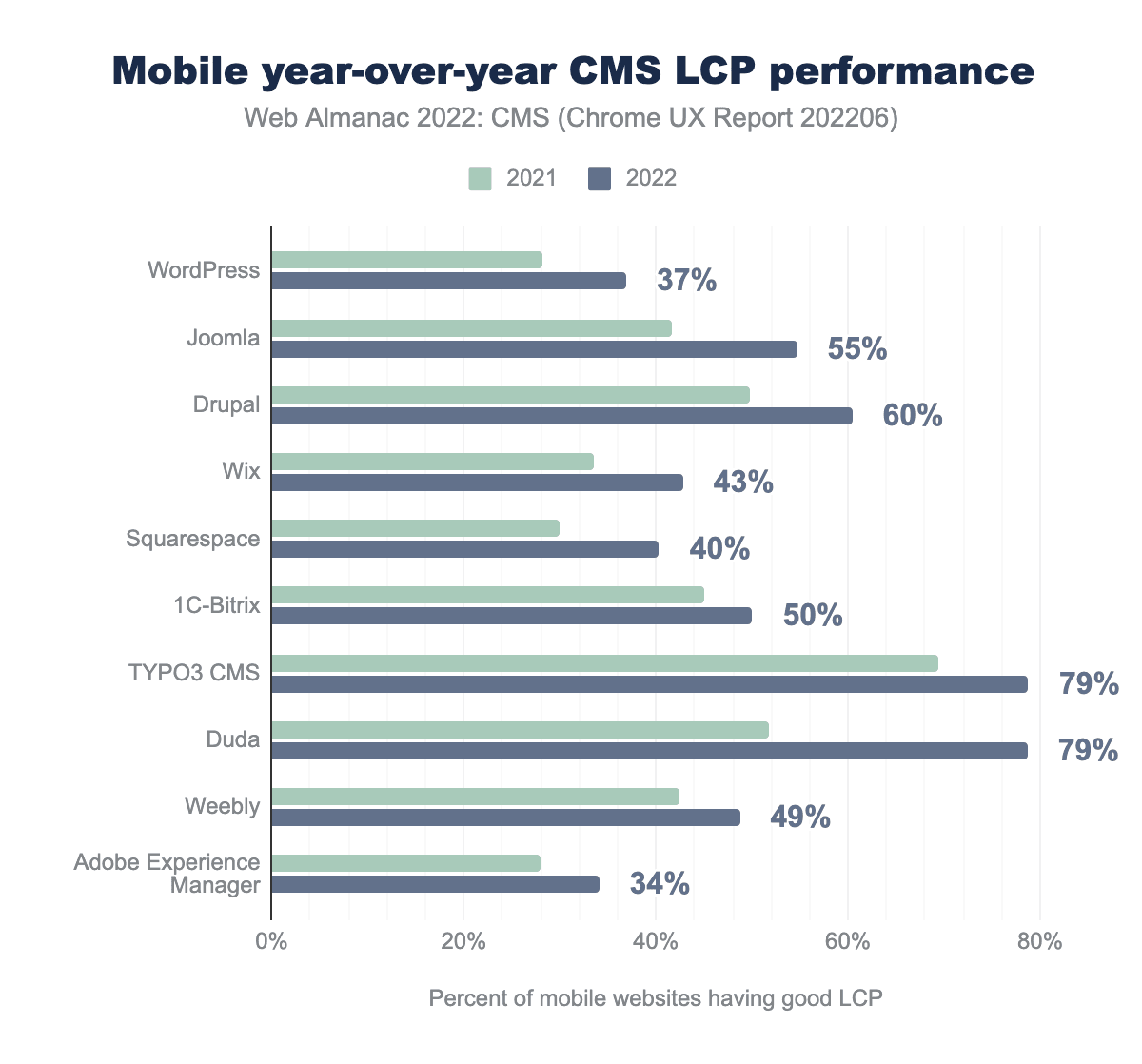 Comparing yearly data, we can see that all CMSs made progress. WordPress, Squarespace, Duda, and Adobe Experience Manager in particular show significant gains.