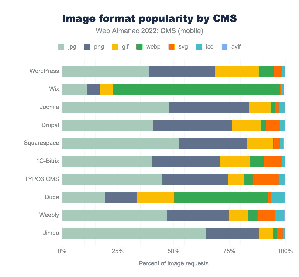We can examine the usage of the different image formats across the top CMSs: