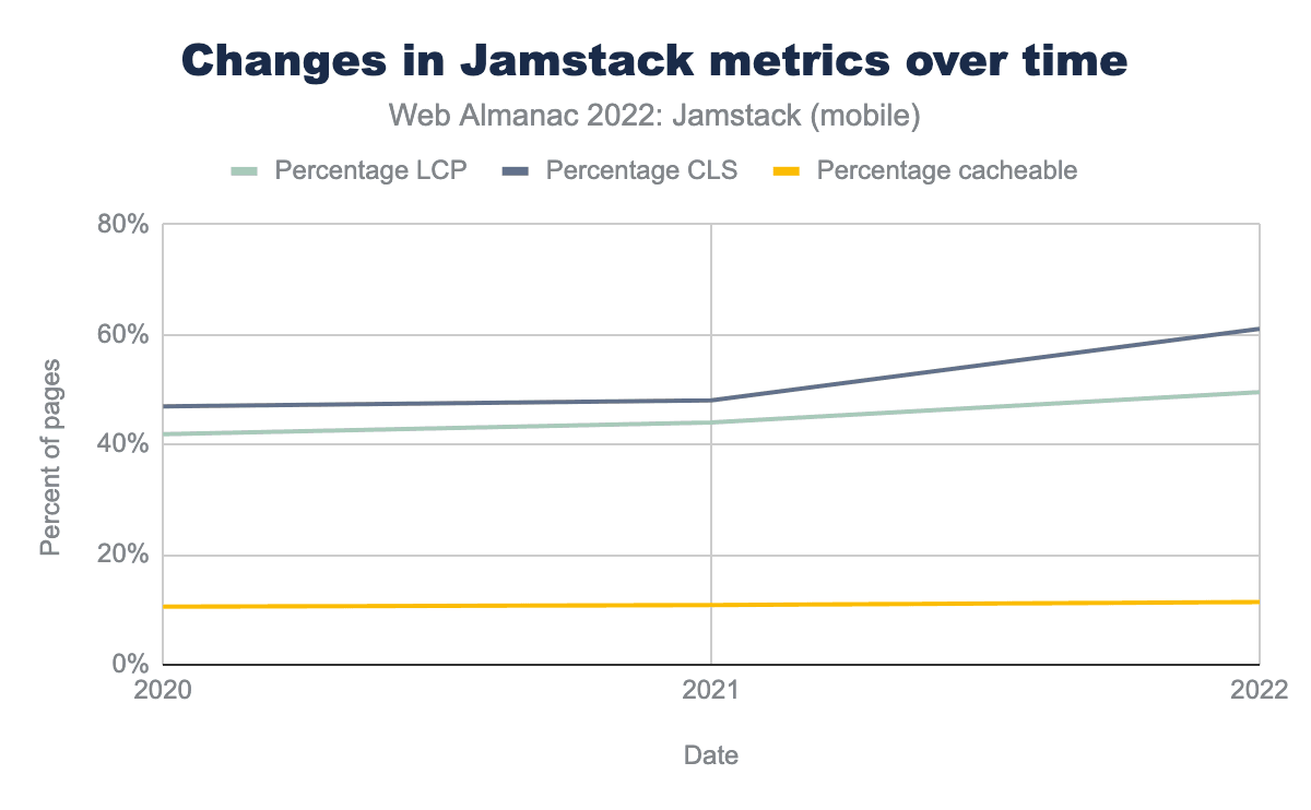 A good question is: why not use Core Web Vitals (CWV) numbers for these metrics? For LCP, our numbers are nearly the same as CWV. For CLS, the CWV team explicitly relaxed the requirements (their threshold is more than double the median) which we thought was not representative of a Jamstack experience. So we decided it was fairer to pick the median for both. And CWV does not have a metric for”cacheability”.