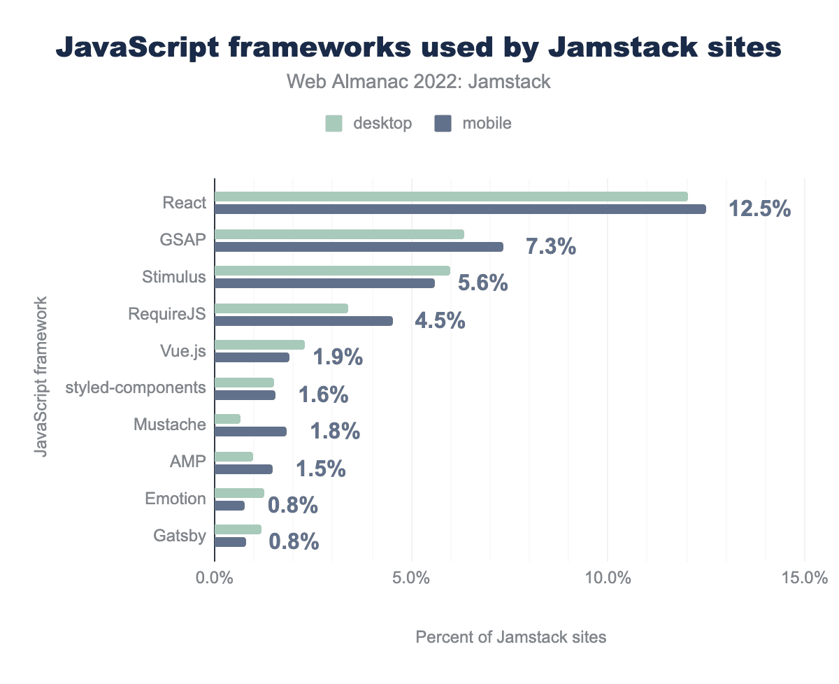 We also found some frameworks and hosting platforms are more popular in the Jamstack than they are in the wider web. This might be because they are technically better at achieving our criteria, or it might just be because Jamstack developers have community preferences for specific stacks.