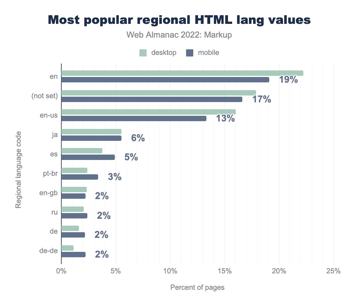 en is the language set on 22% of desktop and 19% of mobile pages, (not set) on 18% and 17% respectively, en-us on 16% and 13%, ja on 6% and 6%, es on 4% and 5%, pt-br on 2% and 3%, en-gb on 2% and 2%, ru on 2% and 2%, de on 2% and 2%, and de-de on 1% of desktop and 2% of mobile pages..What about languages? In our data set, 35% of pages used a lang attribute mapping to English; 17% had no language set; and you already see the difficulties—the sample is likely biased and also not as big as to reflect all of the world, and no lang attribute being used is not equaling no language being set so, this isn’t something our data would be useful for.