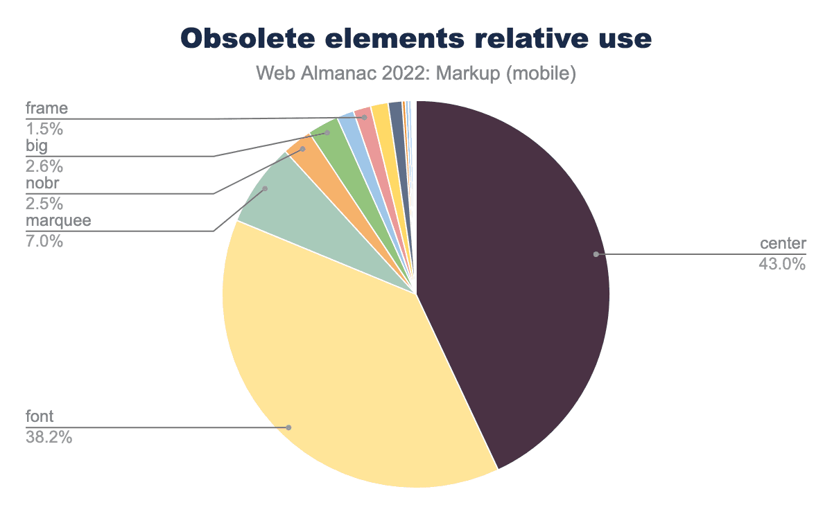 center is used on 6.3% of desktop and 6.1% of mobile pages, font is used on 5.7% and 5.4% pages respectively, marquee on 0.8% and 1.0%, nobr on 0.5% and 0.4%, and finally big 0.4% of desktop and mobile pages.On 6.1% of pages, you still find center elements (hi Google home page), and on 5.4% of pages, you find font elements. Use of both elements went down (down 0.5% in both cases), fortunately, while marquee, nobr, and big didn’t witness significant changes.