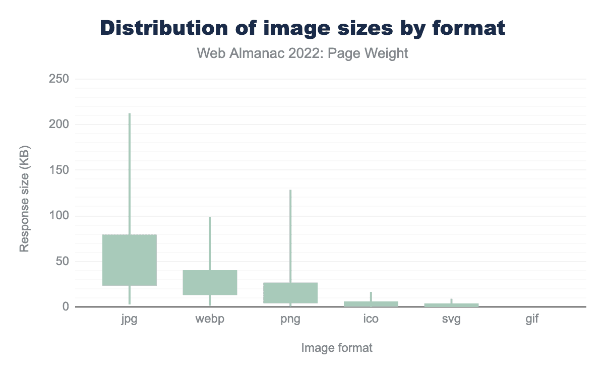 Distribution of image sizes by formats shows us that JPG, WebP, and PNG file formats retain their 2021 status as top sources of image weight.