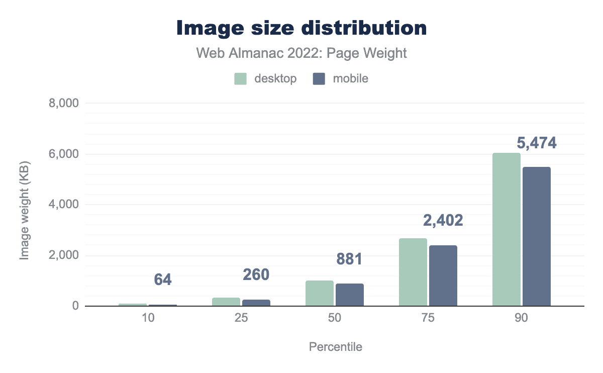 The median desktop image weight for 2022 was 1,026 kilobytes, a mere 44 kilobyte increase from 2021. Mobile barely shifted at 881 kilobytes.