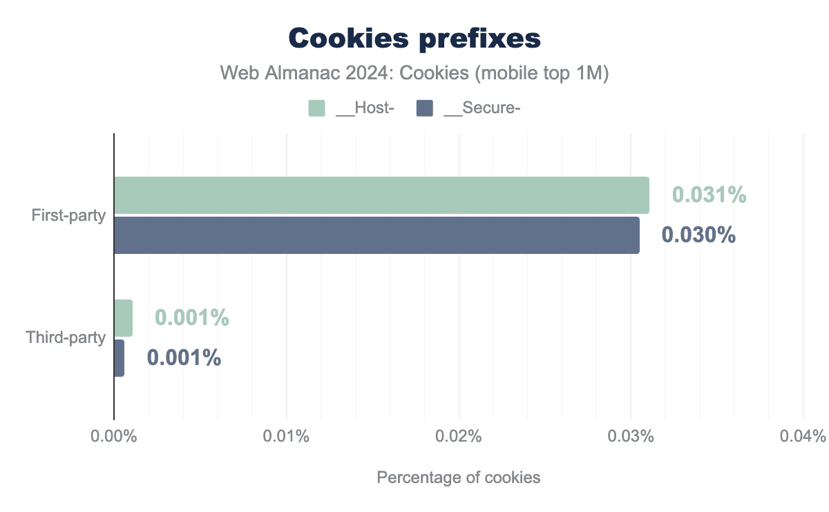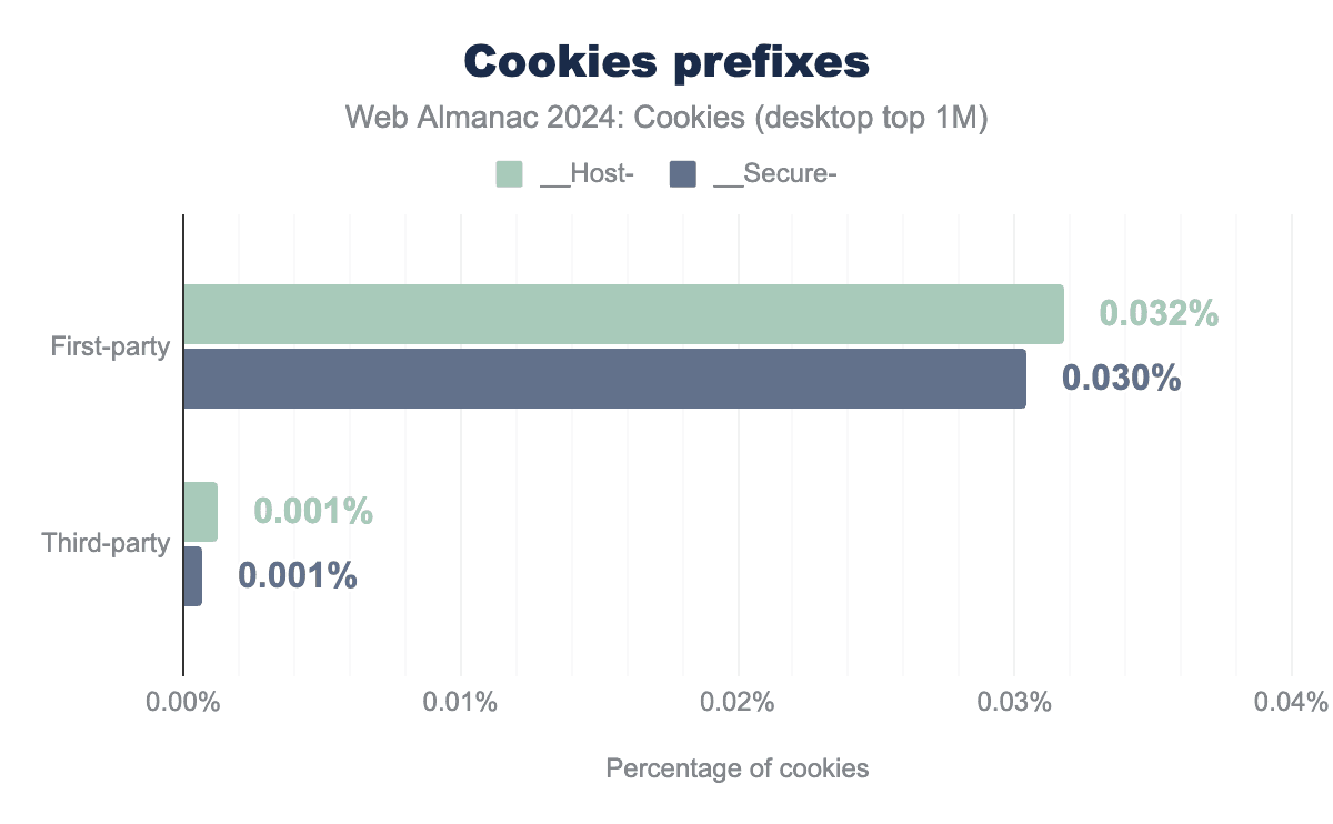 __Host-. Similarly, 0.03% of first-party cookies and 0.001% of third-party cookies include __Secure-. __Host-. Similarly, 0.03% of first-party cookies and 0.001% of third-party cookies include __Secure-. We measure that 0.032% and 0.030% of the first-party cookies observed on desktop have the __Host- and __Secure- prefix set, respectively. These numbers are 0.001% for third-party cookies. These results show the very low adoption of these prefixes and the associated defense-in-depth measure since they were first introduced at the end of 2015.