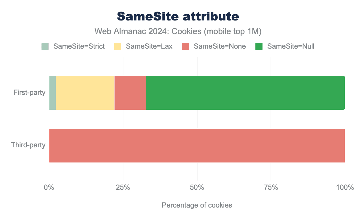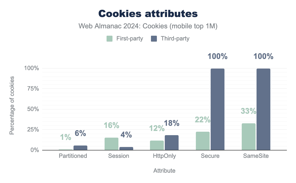 SameSite and Secure attributes. Only 1% of first-party cookies and 6% of third-party cookies use Partioned. 16% of first-party cookies set their Session attribute, while this is the case for only 4% of third-party cookies. Finally, 12% of first-party cookies and 19% of third-party cookies use the HttpOnly attribute.SameSite and Secure attributes. Only 1% of first-party cookies and 6% of third-party cookies use Partioned. 16% of first-party cookies set their Session attribute, while this is the case for only 4% of third-party cookies. Finally, 12% of first-party cookies and 19% of third-party cookies use the HttpOnly attribute.