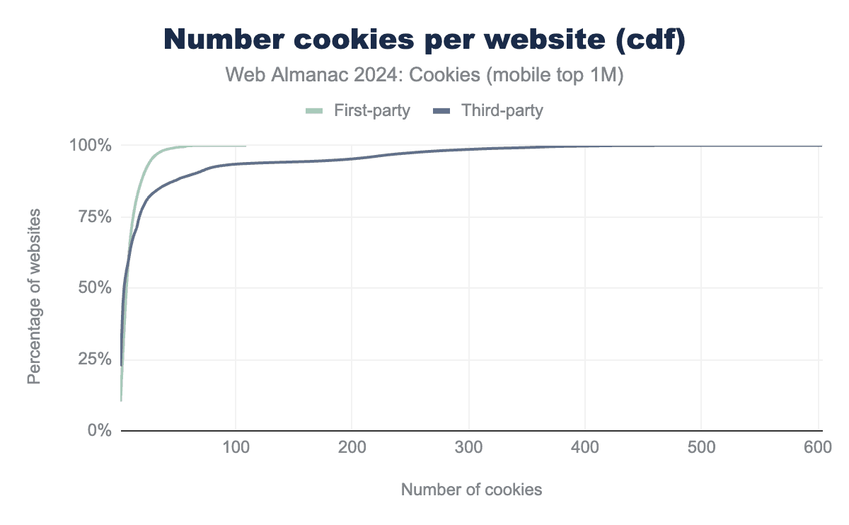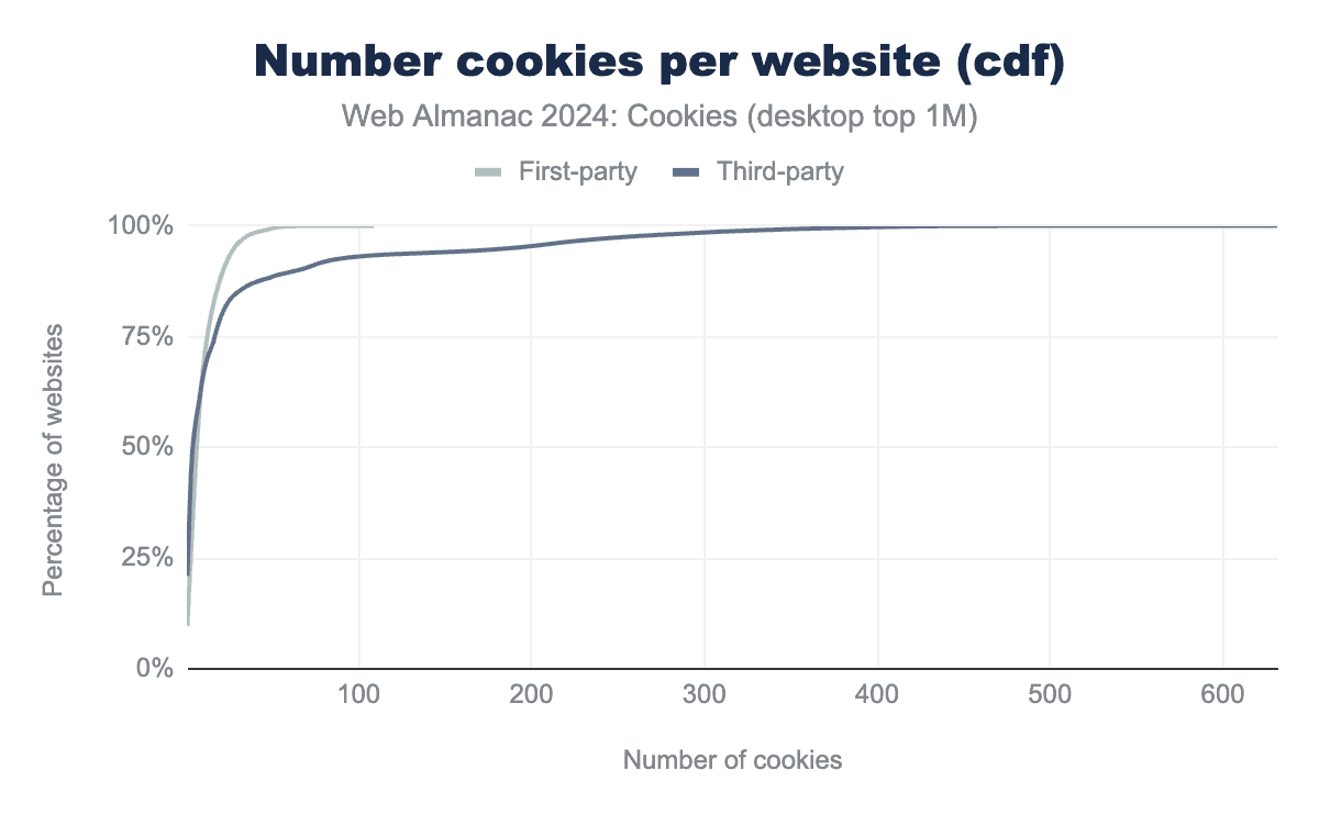 On the top one million most visited websites, about 39% of the cookies are first-party and 61% are third-party cookies. Thus, a majority of the cookies set on the web are third-party cookies. We also observe that this distribution is very similar whether these websites are accessed through a desktop or a mobile client. This indicates that overall there is little to no behavior change based on the type of client used. However, some websites may still behave differently and/or use other tracking methods such as fingerprinting depending on the type of client (see the Privacy chapter for more).
