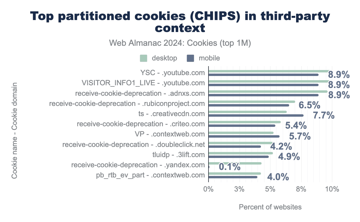 YSC and VISITOR_INFO1_LIVE are set by youtube.com on 9.9% of desktop websites and 8.9% of mobile websites. Most of the top domains using CHIPS belong to the advertising or analytics category.Perhaps a bit surprising, 1% of all the first-party cookies that are set on the top one million websites (desktop and mobile client) are partitioned. However, partitioning cookies in a first-party context appears to be a bit redundant as first-party cookies are already accessible, by definition, only by that first-party on that top-level site. The following figure displays the top ten partitioned cookies set in first-party context for each client. receive-cookie-deprecation is set by domains that participate in the testing phase of Chrome’s Privacy Sandbox. cf_clearance and csrf_token are cookies set by Cloudflare to indicate that the user has successfully completed an anti-bot challenge or to identify trusted web traffic, respectively.