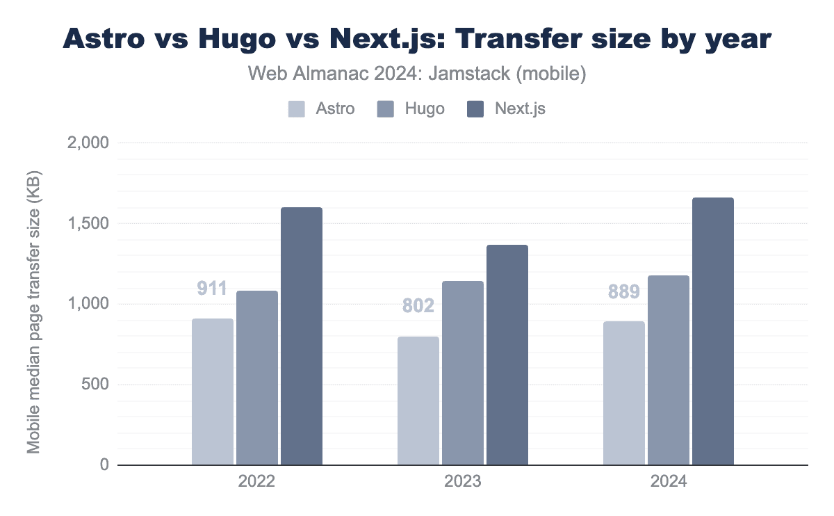 Figure 14.15. Astro vs Hugo vs Next.js: Transfer size by year.