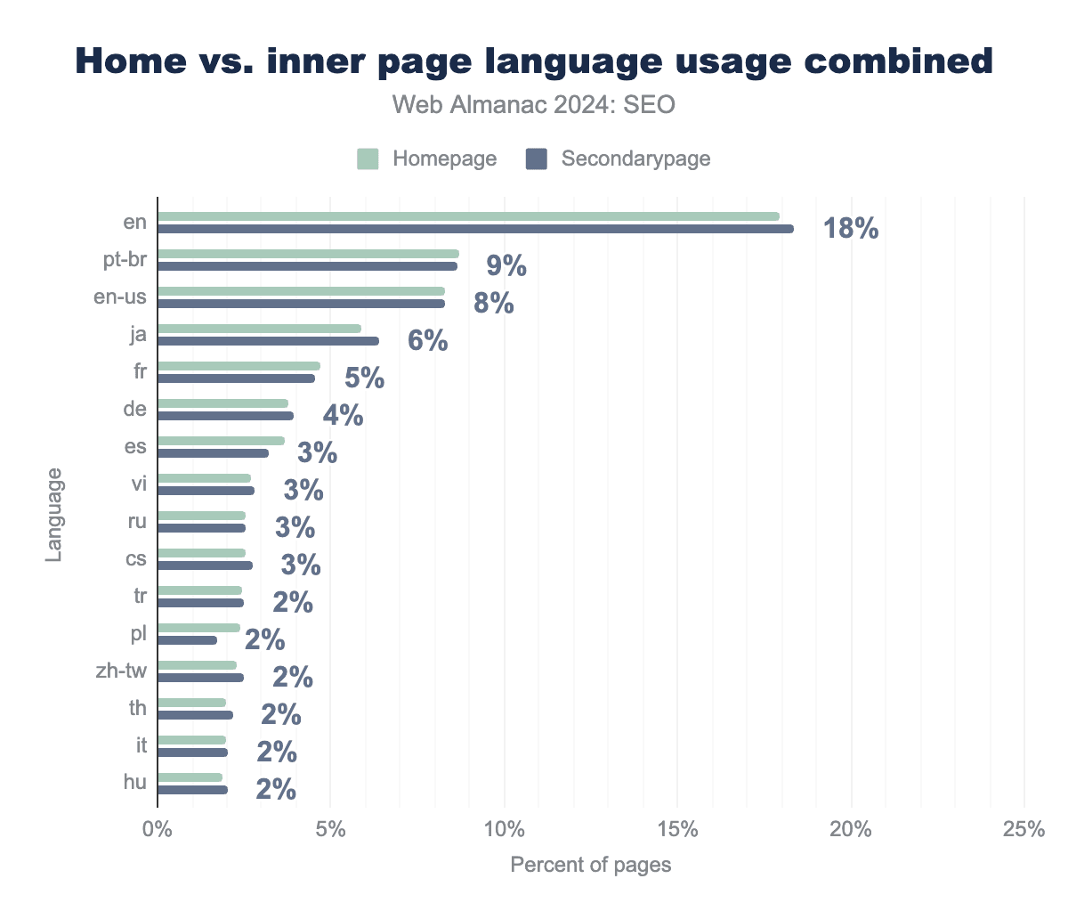 When examining language usage data for home pages and inner pages (the latter of which were not discussed in 2022), English (en) appeared as the main element (home page: 18% and inner page: 18%), followed by pt-br (home page: 9% and inner page: 9%), en-us (home page: 8% and inner page: 8%), and ja (home page: 6% and inner page: 6%).