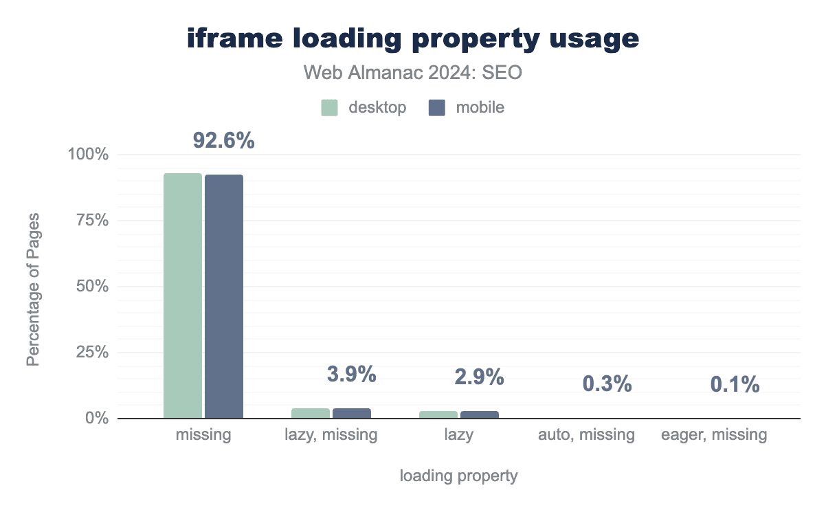 Nearly all sites employing iframes also use the indexifembedded directive. When iframe headers from mobile pages were examined, 99.9% used noindex directives and 97.8% used indexifembedded.