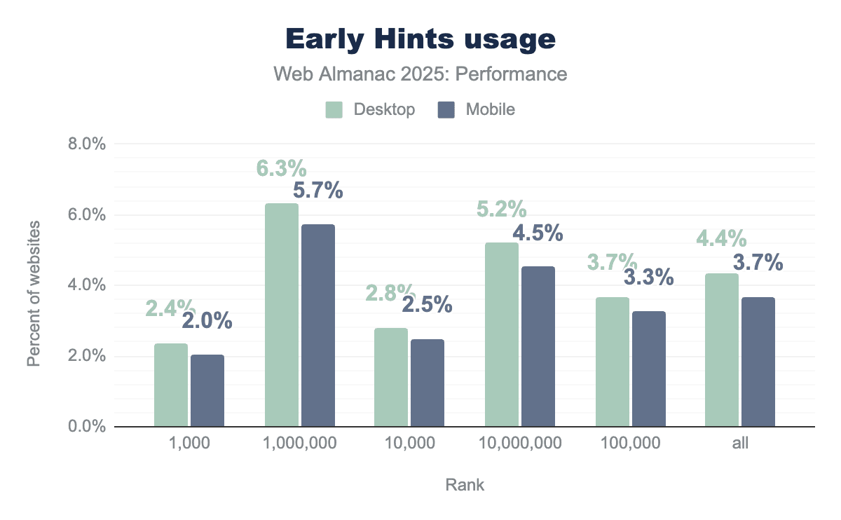 The mobile/desktop parity is also quite noticeable; never more than a 1% difference, and typically closer to 0.5%. Meaning, where Early Hints are implemented, they are likely done so similarly for all device types.