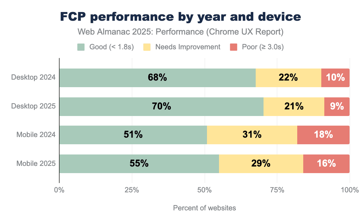 Notably, the mobile-desktop performance gap has begun to narrow, shrinking from 23 percentage points in 2024 to 20 percentage points in 2025. While a 20 percentage point gap remains substantial, this marks the first measurable step toward closing the divide. The trend demonstrates that mobile optimization efforts are gaining traction across the web.