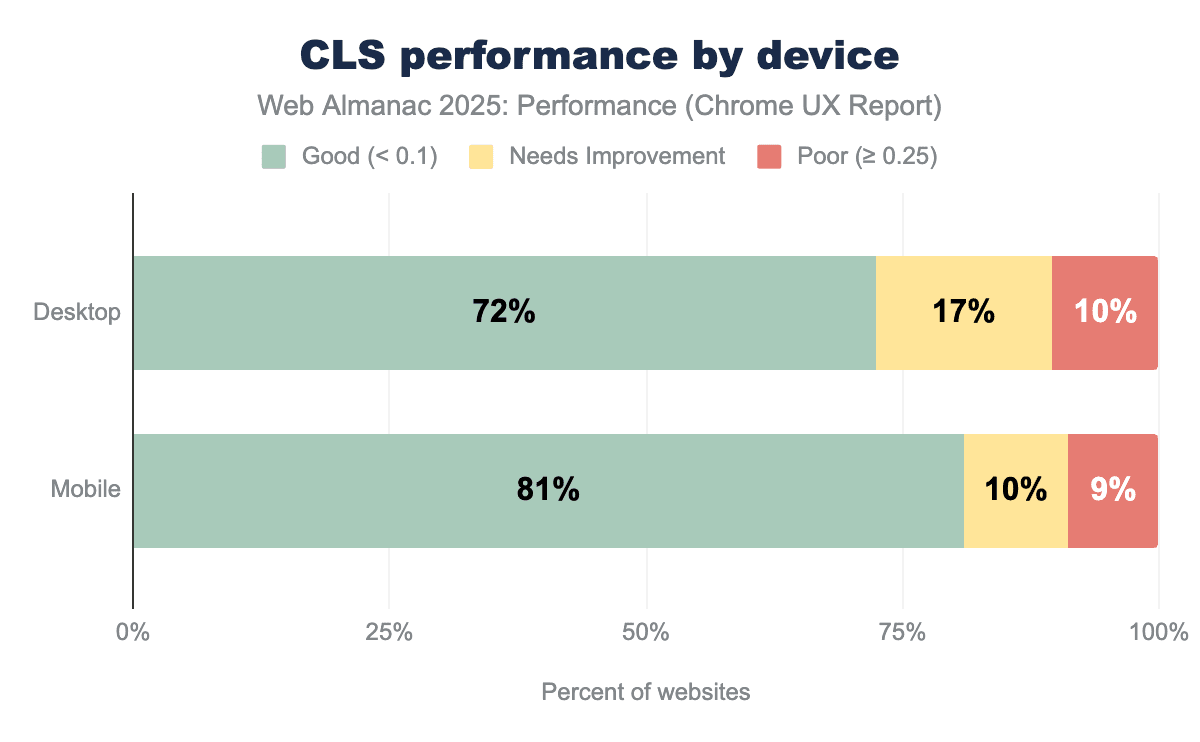 Compared to 2024, the share of desktop pages with “poor” CLS decreased by 1%, with a similar increase in pages classified as “needs improvement”.