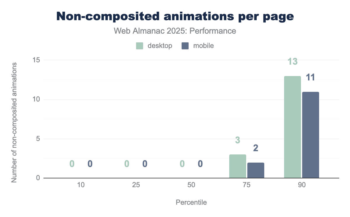 Non-composited animations impact emerges primarily at higher percentiles, with usage increasing at the 75th percentile and rising sharply at the 90th percentile to 13 animations on desktop and 11 on mobile.
