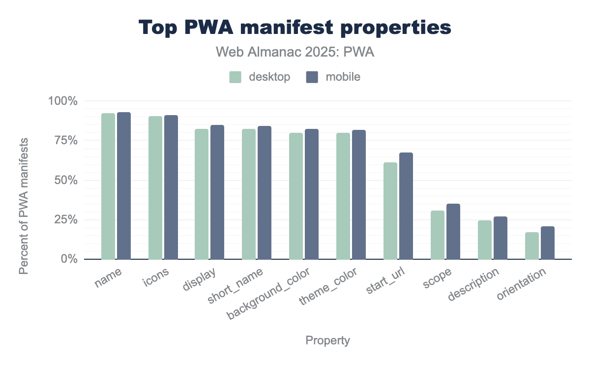 name and icons appearing in over 90% of manifests, followed closely by short_name, display, and theme_color at roughly 80%. Mobile PWAs exhibit slightly higher adoption across every listed property compared to desktop, particularly for functional fields like start_url and scope. Overall, the data illustrates a high level of standardization for basic PWA identification, while more descriptive or restrictive properties like description and orientation remain significantly less common.Straight up, these are the most used PWA manifest properties: name, icons, short_name, display and background_color. The top 4 most used properties are the same ones from 2022, with subtle notable changes regarding their order.
