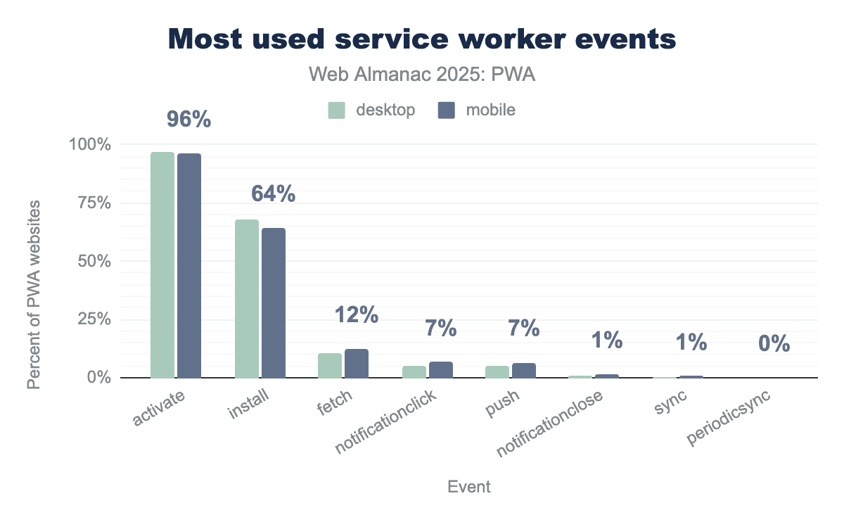 activate event appearing on 96% of PWA sites and the install event used by 64%. Functional events see lower but notable adoption, with fetch at 12% for intercepting network requests and push and notificationclick both at 7%.The most used event for these service workers is the activation (activate) with almost every service worker using it, around 96% of PWAs using it. The install event takes second place with around 64% usage. Both install and activate are core lifecycle events so these numbers do not come as a surprise. This might suggest that applications are caching resources to speed up their loading times and performing service worker management.