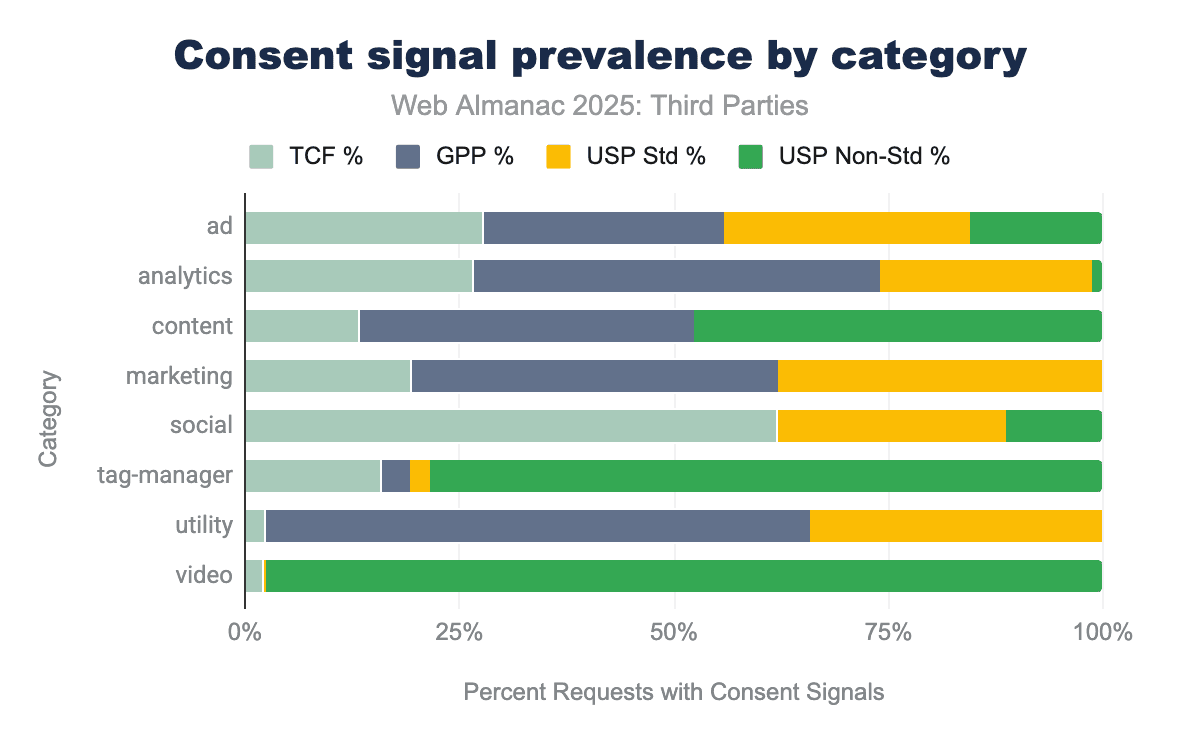 We observe different consent standard preferences across different third-party categories. For example, Social services show the highest TCF adoption, while advertising vendors employ a more balanced mix of GPP, USP Standard, and smaller TCF shares. Furthermore, Analytics vendors predominantly adopt GPP.