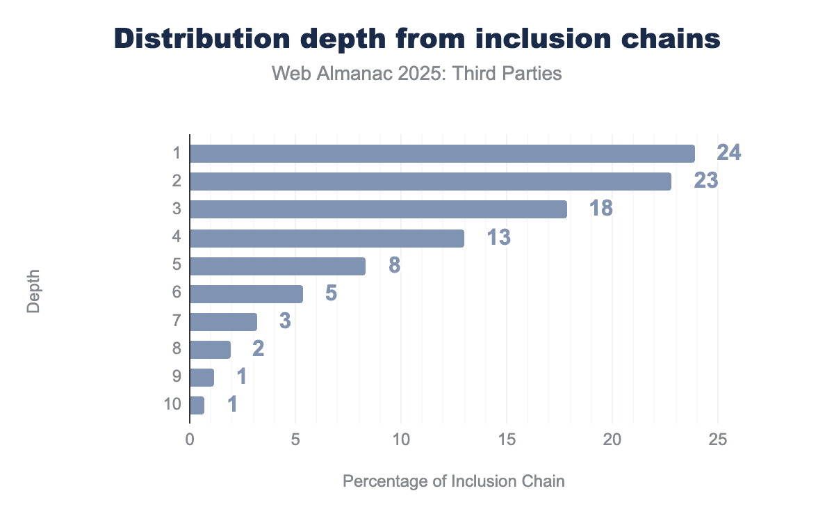 The median depth of the inclusion chain is 3 which means the majority of the third parties include at least another third party on a web page. The maximum depth of the inclusion chain is 2,285.