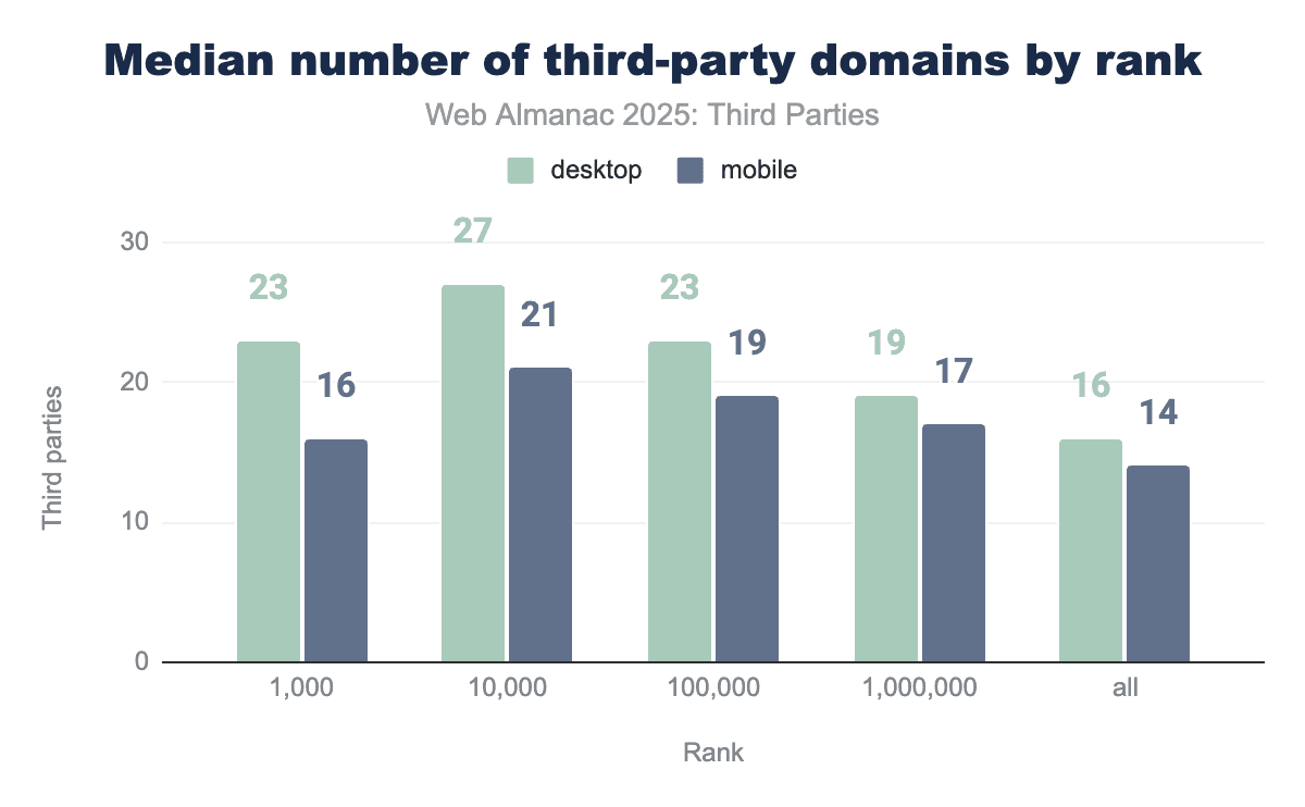 Year-over-year, third-party requests have increased across all ranks. The top 1,000 sites show an increase of 15 requests on desktop and 15 on mobile compared to 2024, while the broader dataset increased by five requests on desktop and five on mobile. This upward trend occurs despite the decrease in the number of unique third-party domains we observed earlier, suggesting that individual third parties are sending more requests per page.